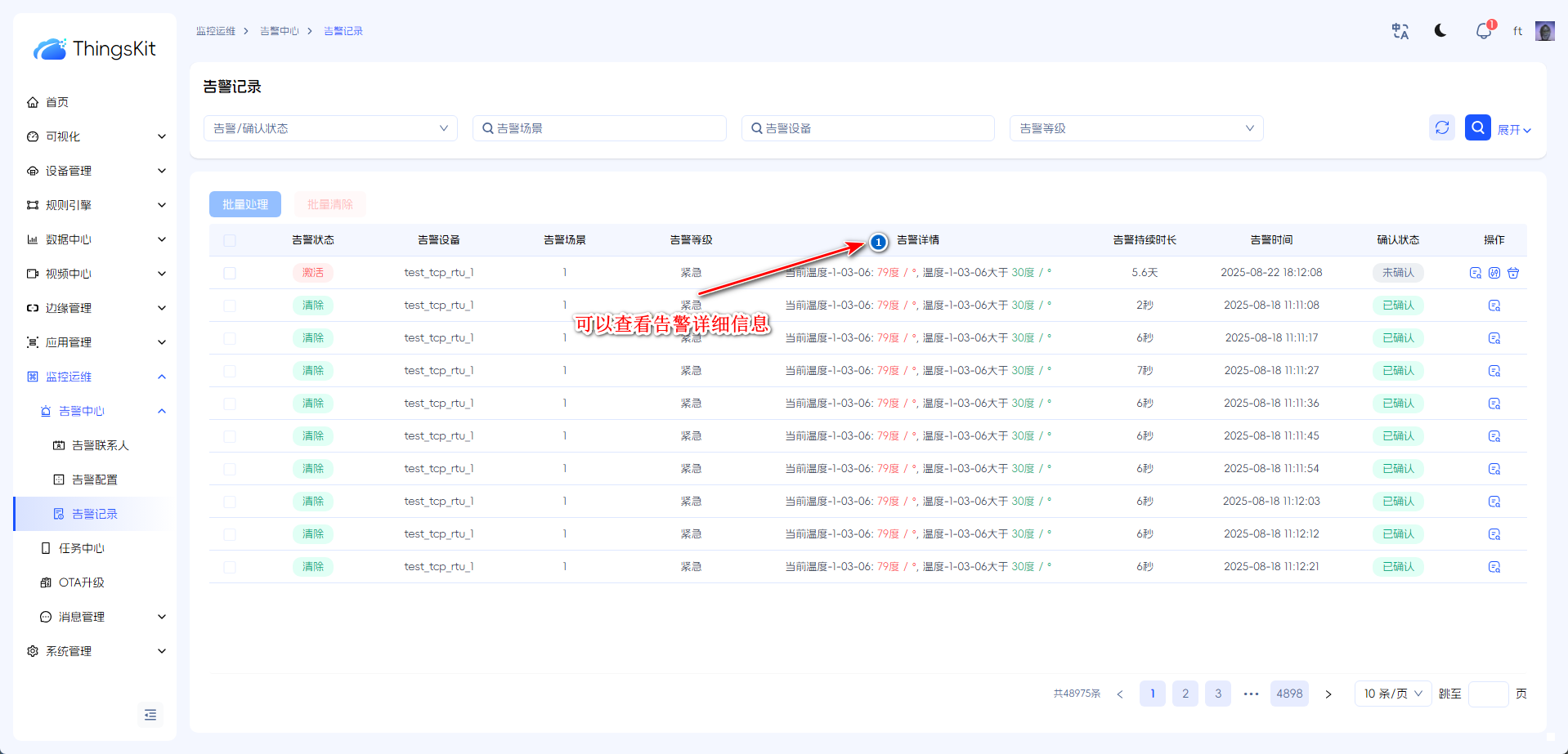 当设备达到预先指定的阈值时,平台会自动产生告警,可以通过告警记录及时查看详细的告警信息以及对告警进行处理和反馈。
