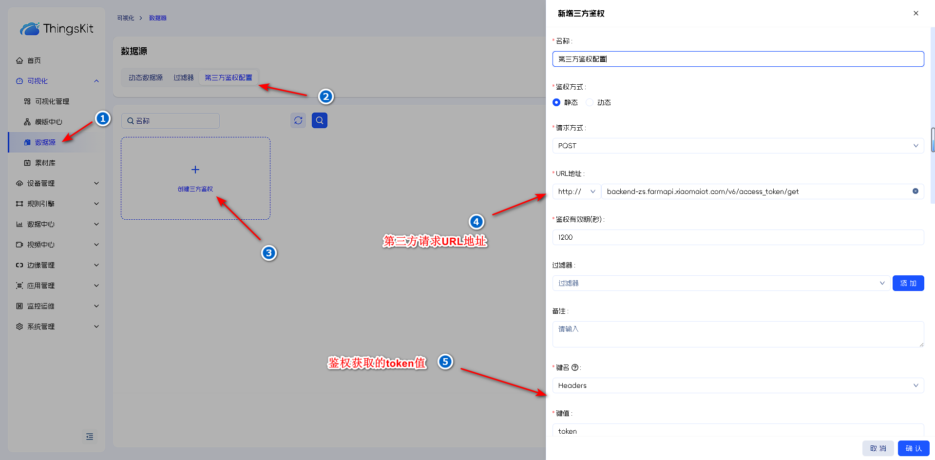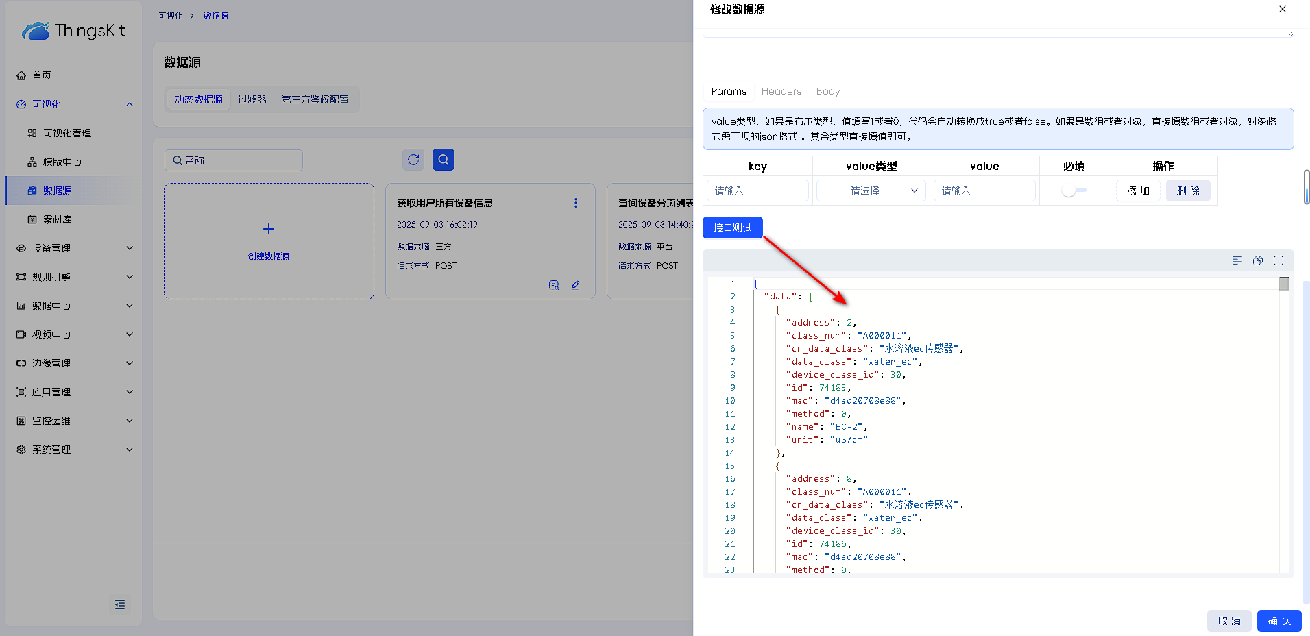 参数设置中:键名和键值,是在数据源里选择第三方鉴权时携带过去的参数, 示例:如何获取第三方的token?,你选择的Headers,设置的键值为TestToken,动态数据源里点击测试接口,就会加在请求头里, 并以TestToken作为key,TestToken的值是通过编写过滤函数获取的。