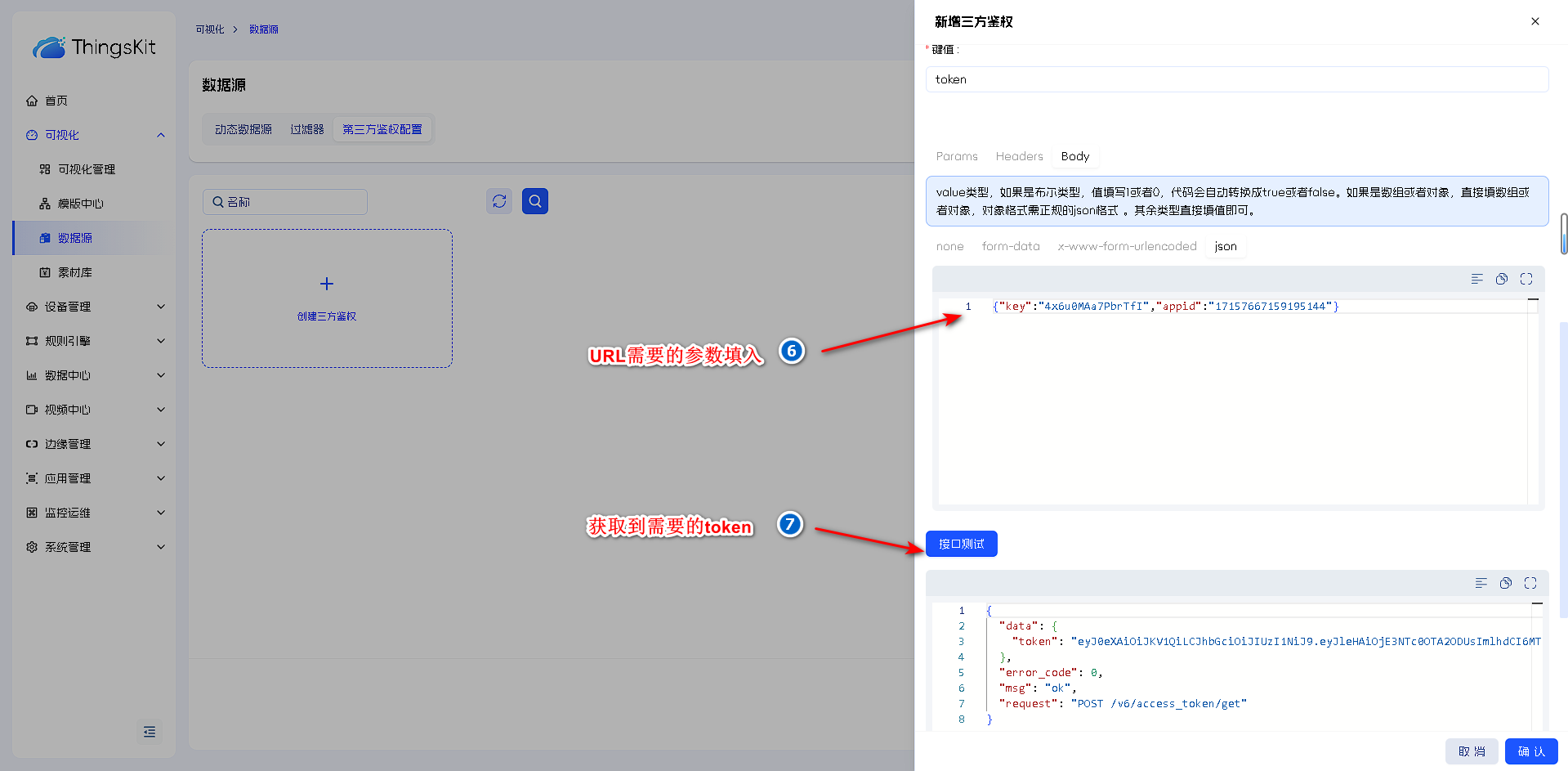 动态数据源请求其它功能接口,需要第三方鉴权的token进行授权才行,如下图。