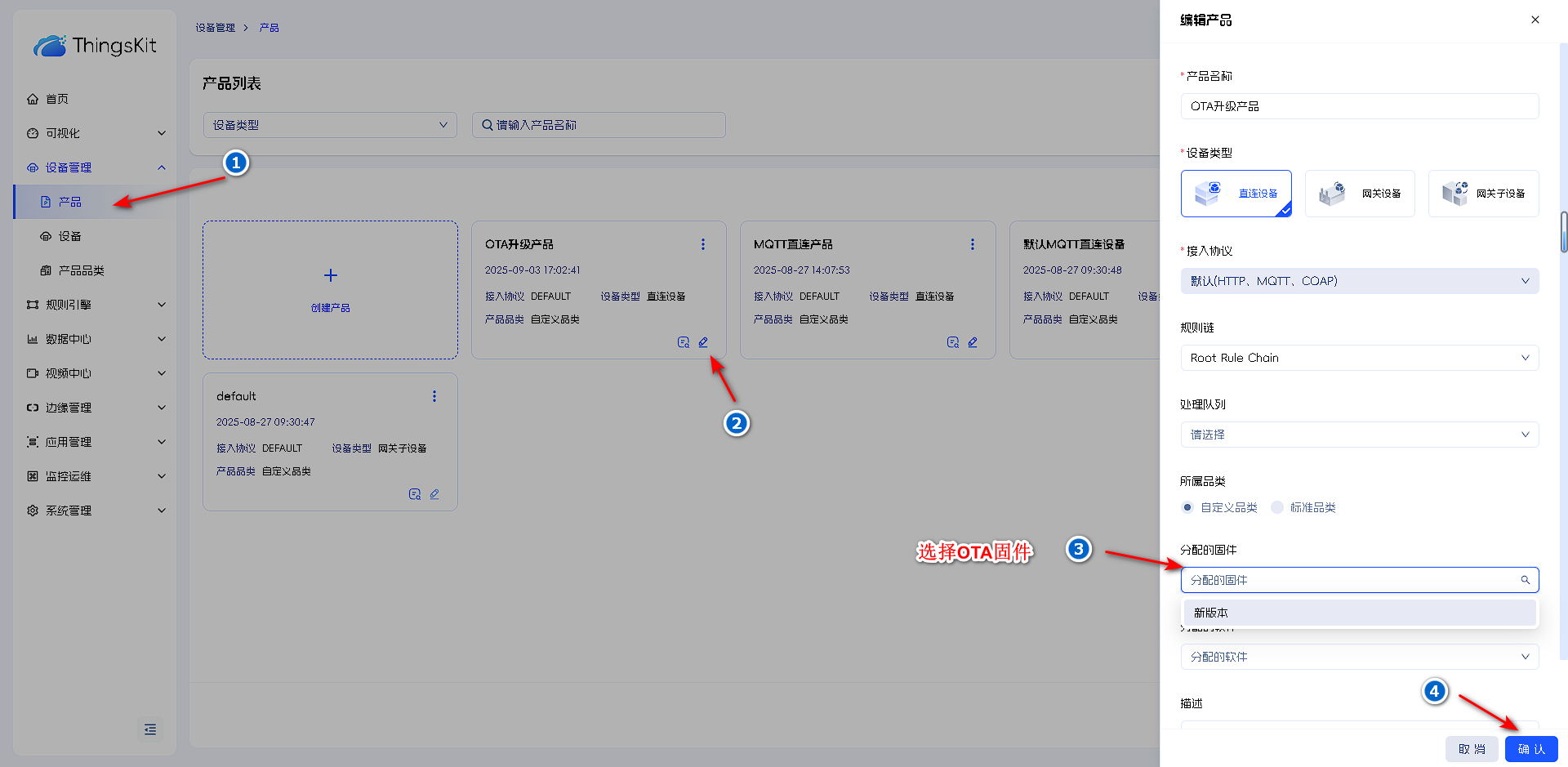 首先,先新增产品,接着在OTA升级中添加固件或者软件并选择所属产品(新增的产品)。