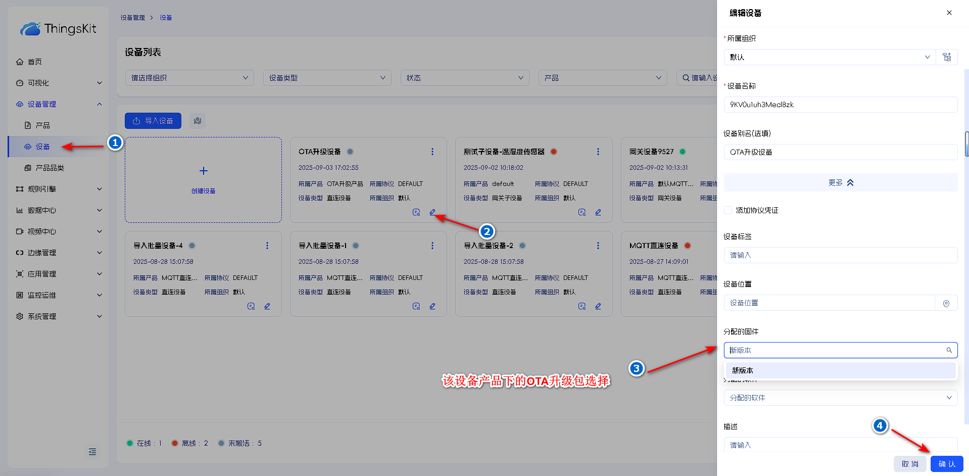 新增设备,选择分配了固件和软件的产品,设备进行编辑时,再选择所属的固件和软件,这样设备OTA升级包就分配好了。