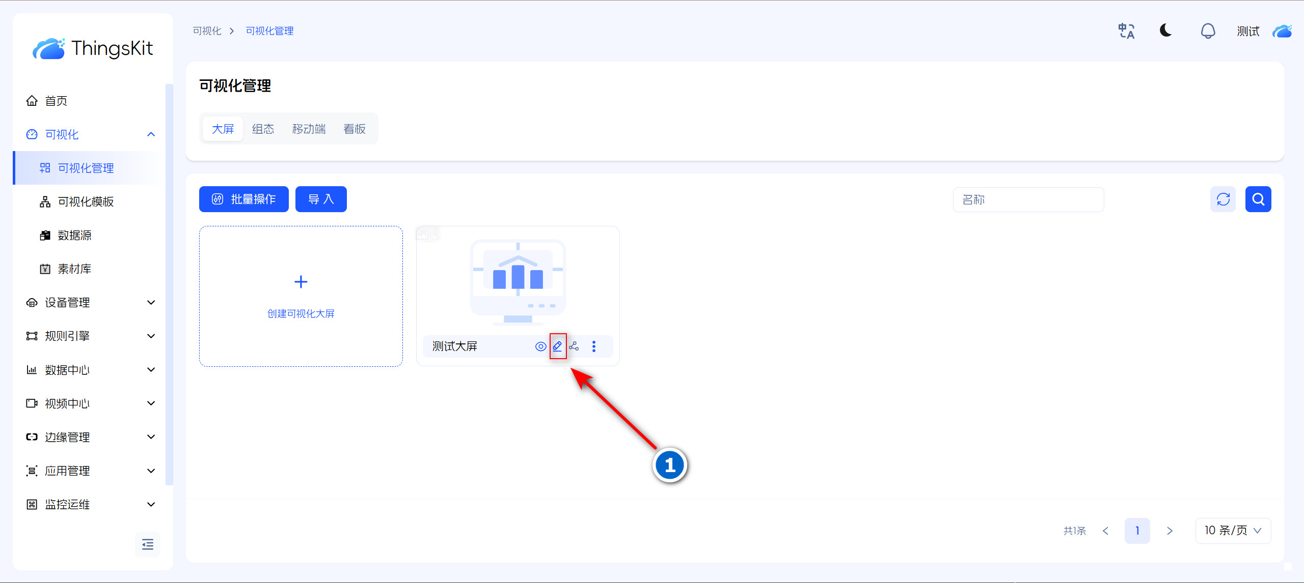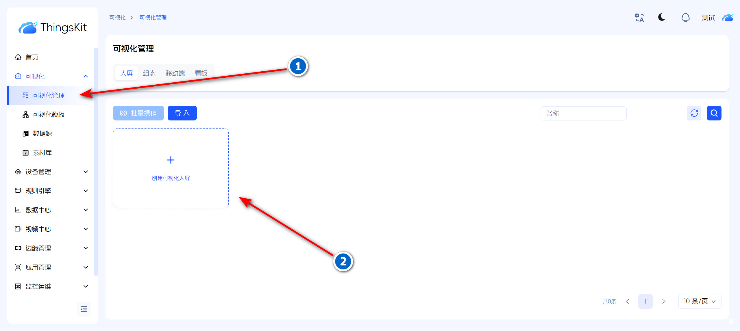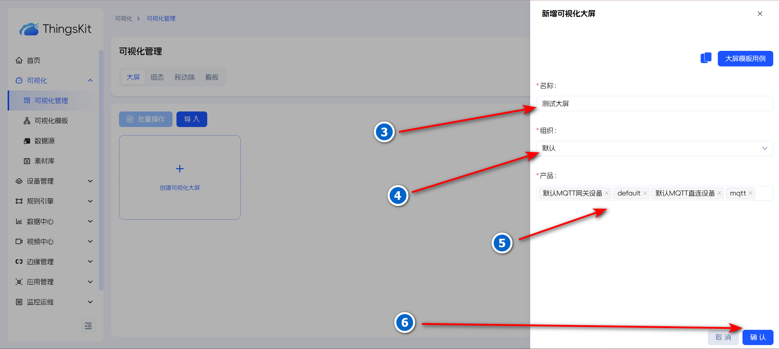 进入可视化管理大屏界面,点击“新增大屏”,在弹出的新增大屏框中,填写大屏名称和选择所属组织及产品,大屏模板可选择设计好的也可不选择进行自主设计;最后单击 “确认”按钮,大屏数据新增成功。