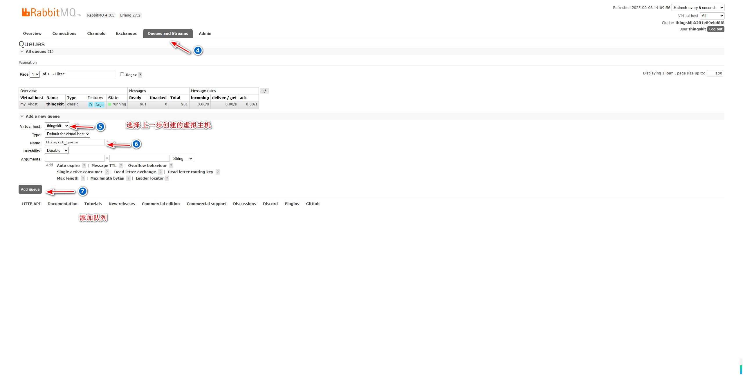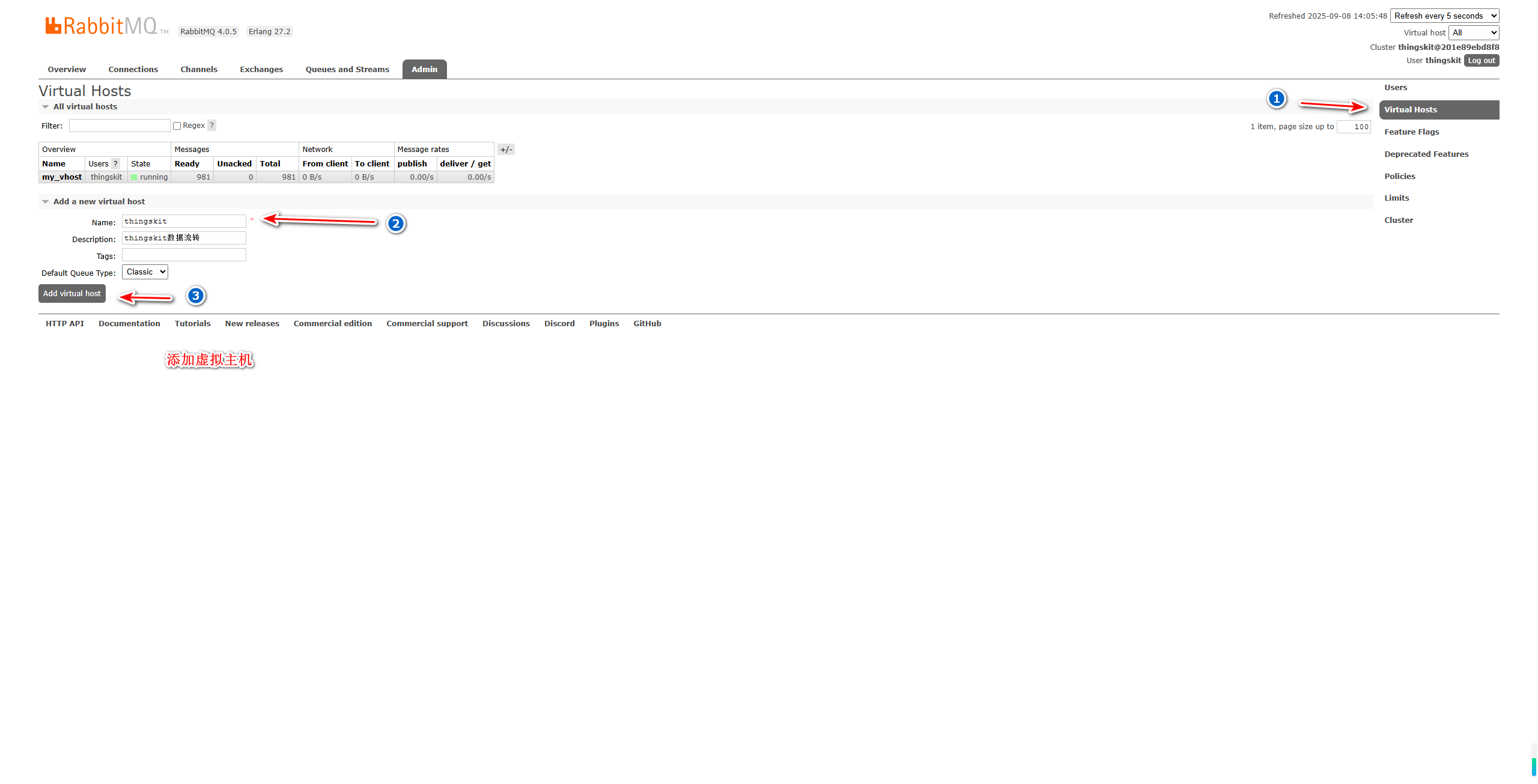 在平台创建RabbitMQ进行数据转发时,建议用户先在RabbitMQ的管理页面,创建自定义的 虚拟主机、队列 和 交换机 并让它们之间形成绑定关系,然后在平台填写使用的RabbitMQ信息。