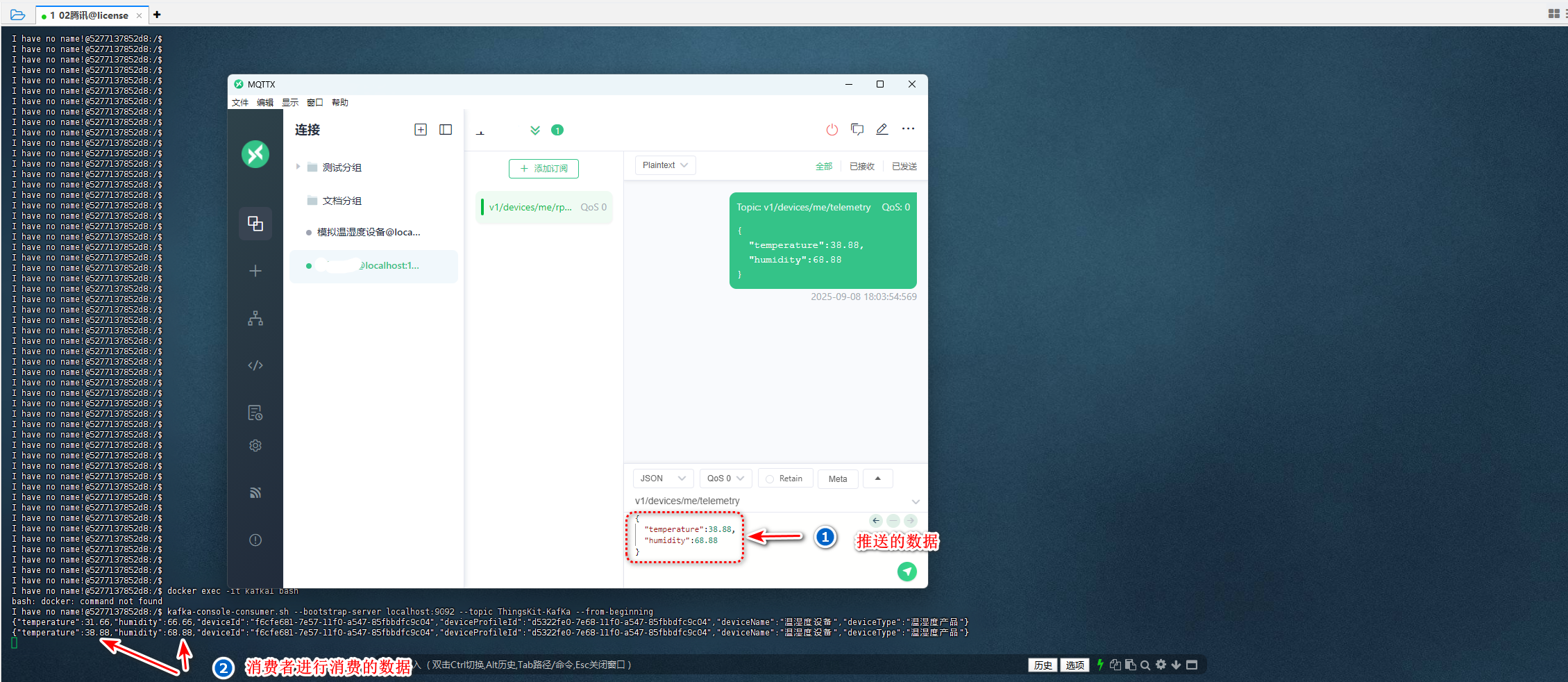 以下示例通过 MQTTX(模拟温湿度设备)、MQTTX(模拟消费者)、EMQ(模拟MQTT Broker) 进行的模拟。