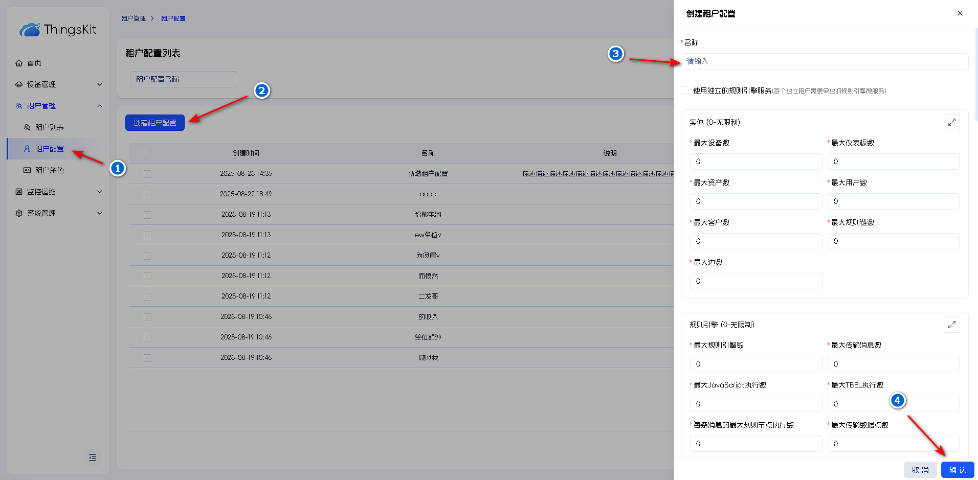 云腾五洲-AI助理 2025年9月9日2025年9月17日 💡 注意 配置租户限制,比如限制租户的设备数、消息数、存储大小、API调用次数等等。 租户在使用该租户配置时,无法进行删除。 创建租户配置 本文通过 YUQUE WORDPRESS 同步自语雀 云腾五洲-AI助理