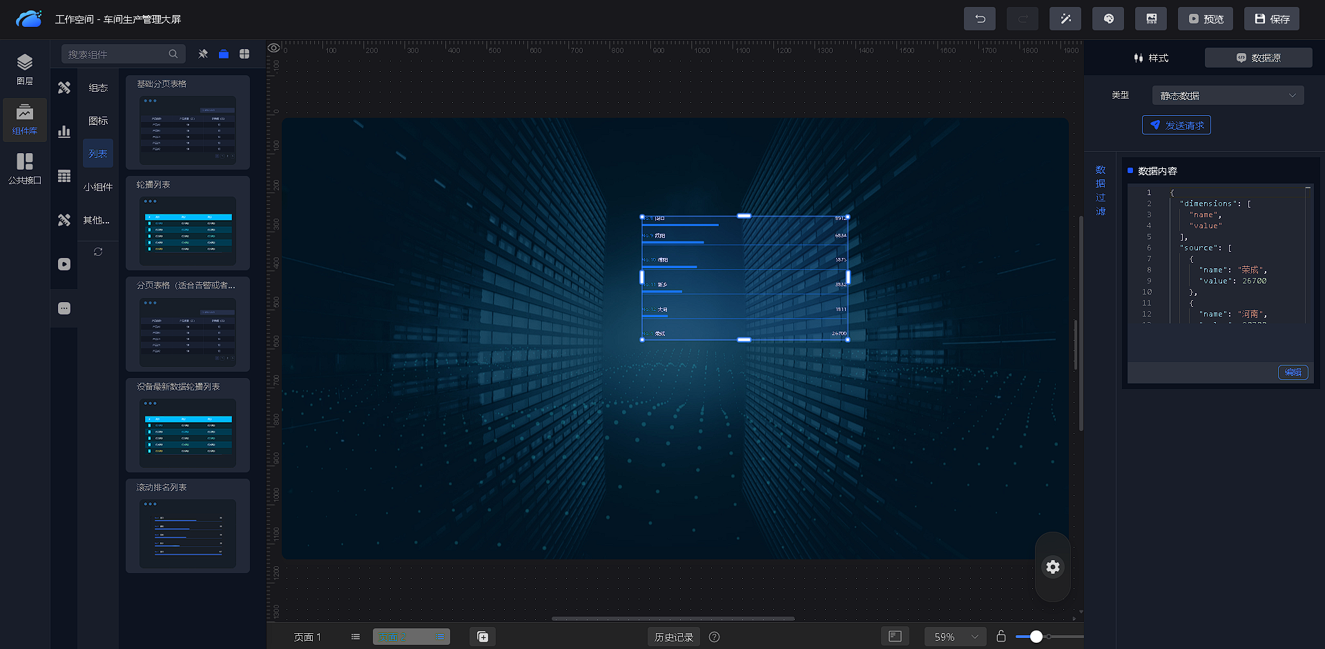- 任意拖动一个列表组件【滚动排名列表】到工作区;【其他图表操作一样】