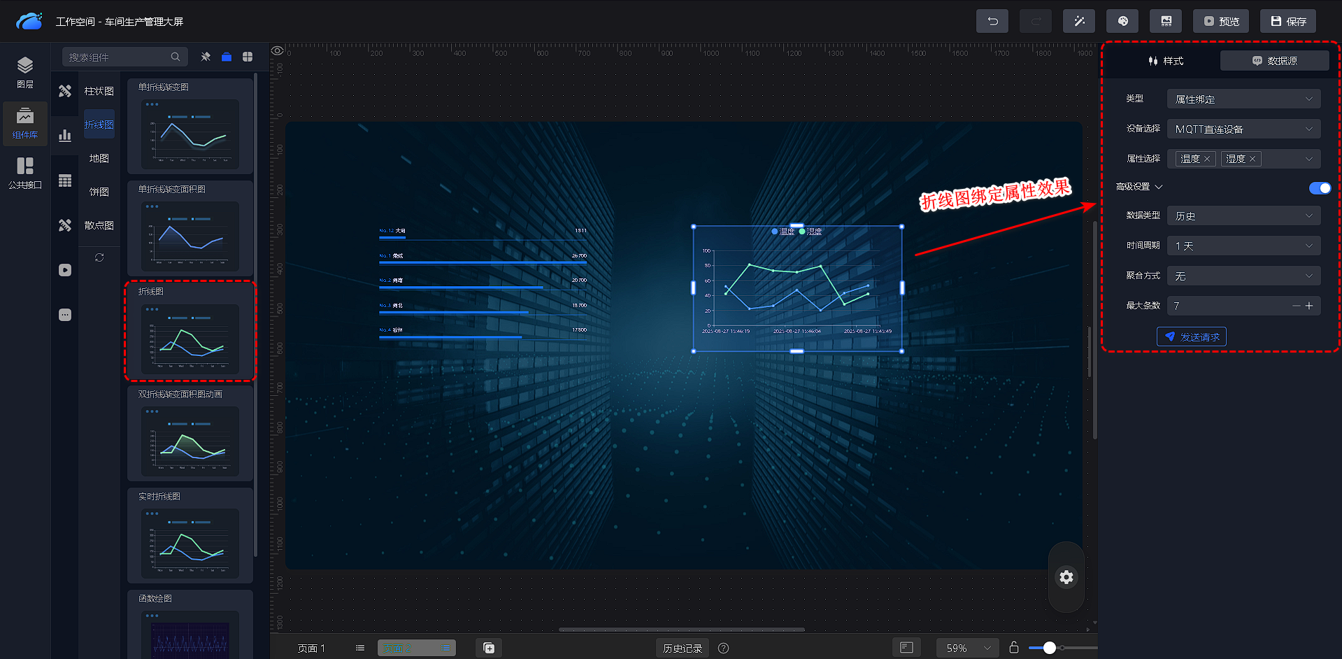 - 进入右侧配置区域;单击数据源,请求方式选择属性绑定并选择设备和属性;