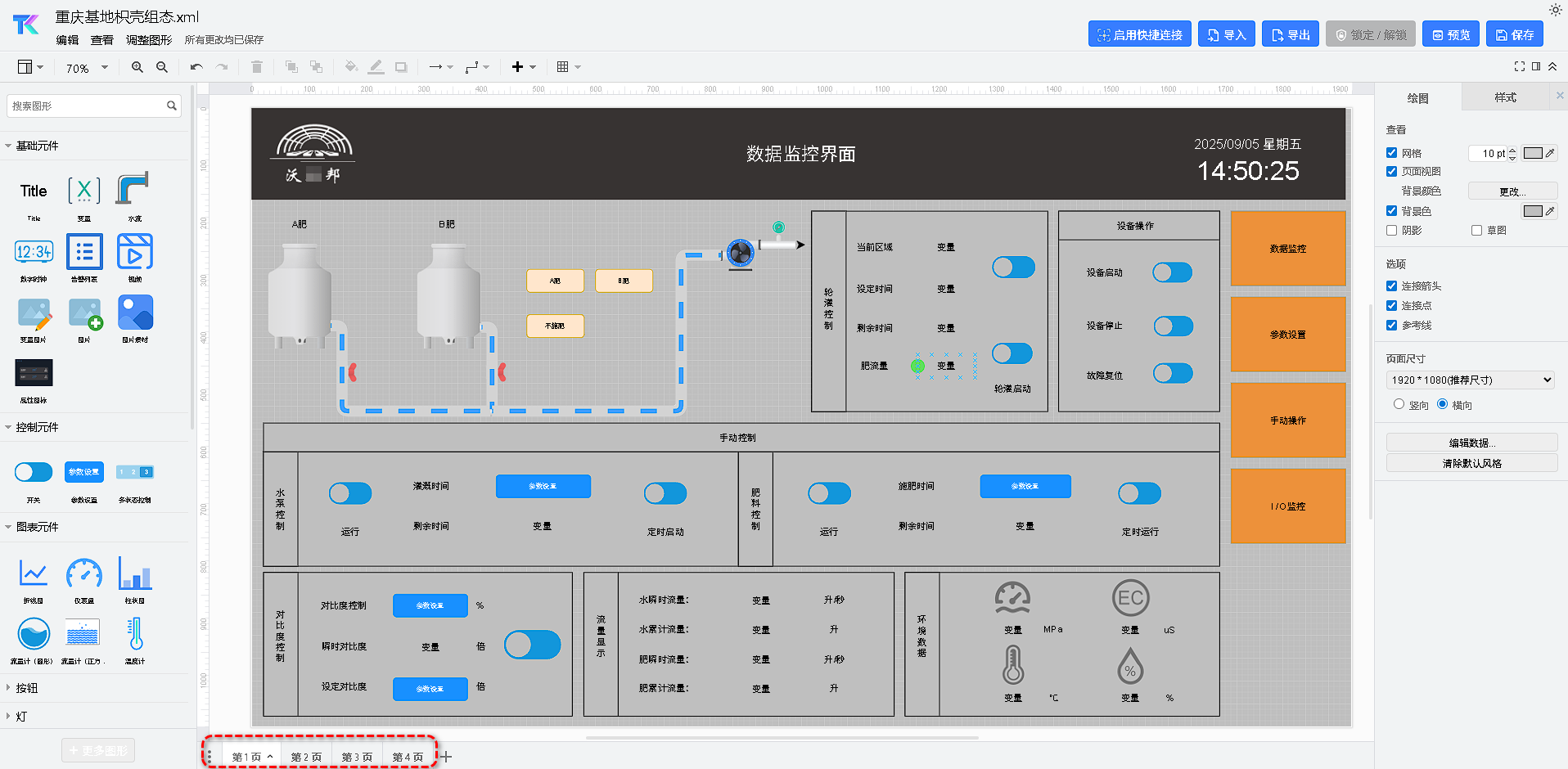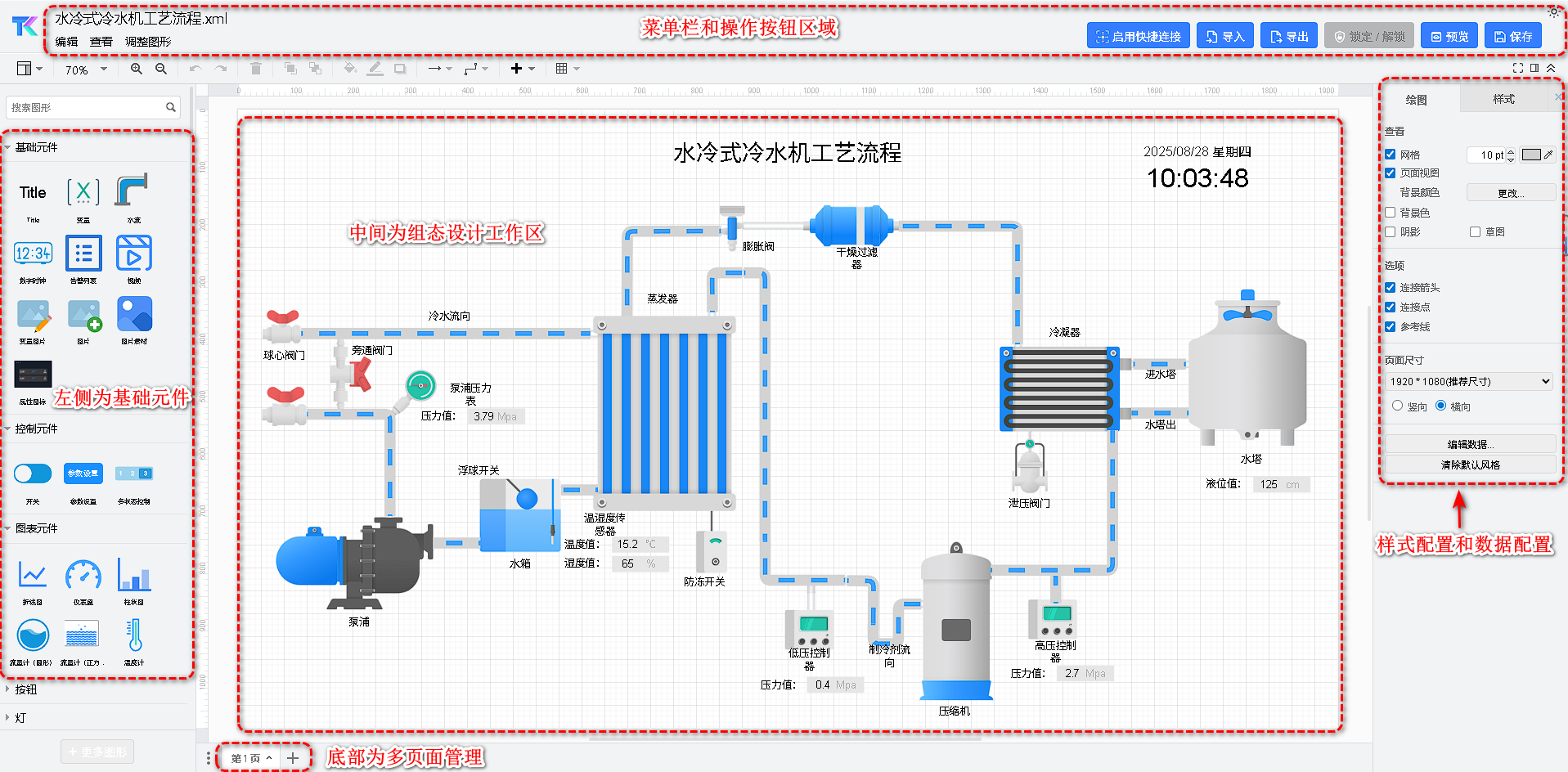 - 导入和导出:用户可以将编辑好的组态页面导出为XML文件,并分享给其他人;导入到编辑器中。