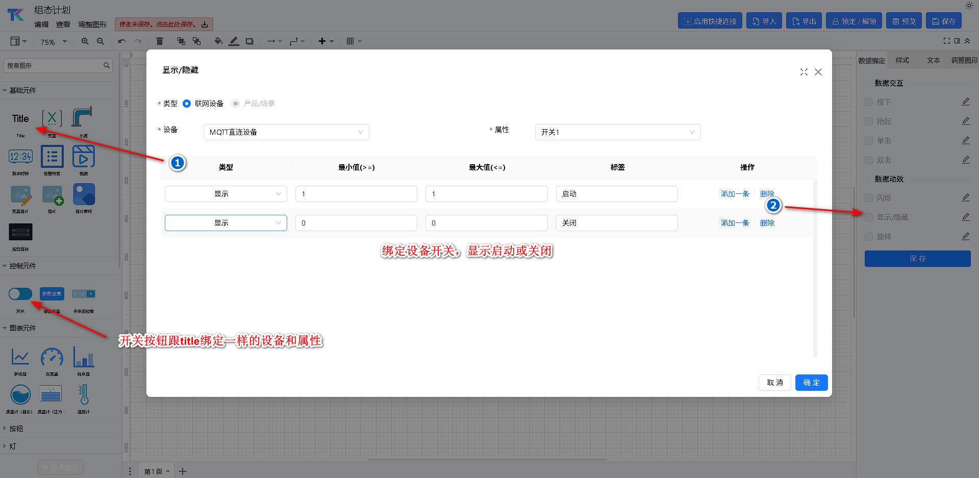 - 单击【数据绑定】;在“数据动效”处设置,点击“显示/隐藏”右侧的编辑按钮;