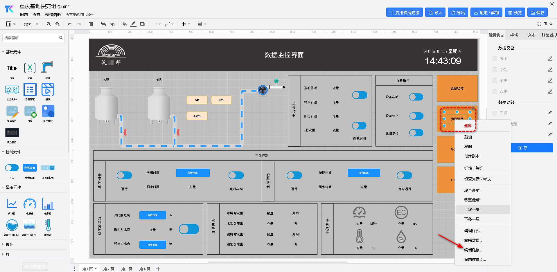 - 可视化编辑:用户可以通过简单的拖拽和放置,添加元素,如文本、变量、视频、图表、控制按钮、参数配置等。