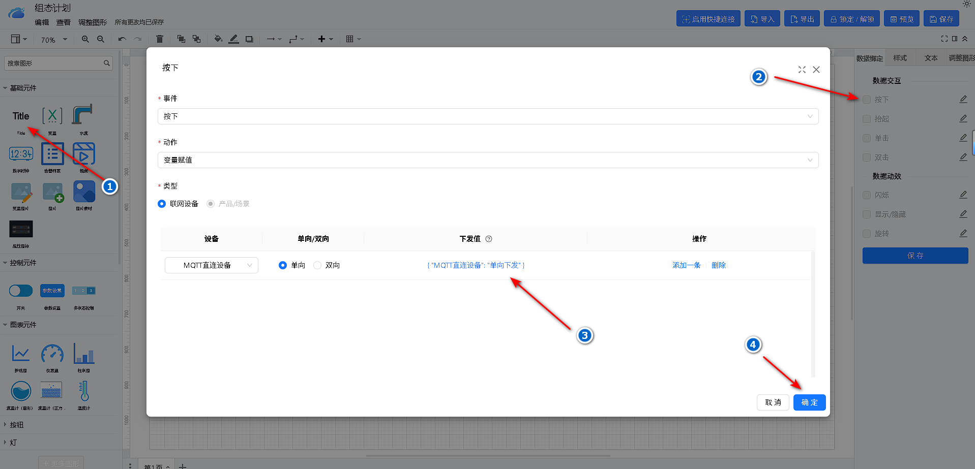 控制数据配置:通过绑定某台设备的控制属性从而在组态页面中实现对设备的控制。