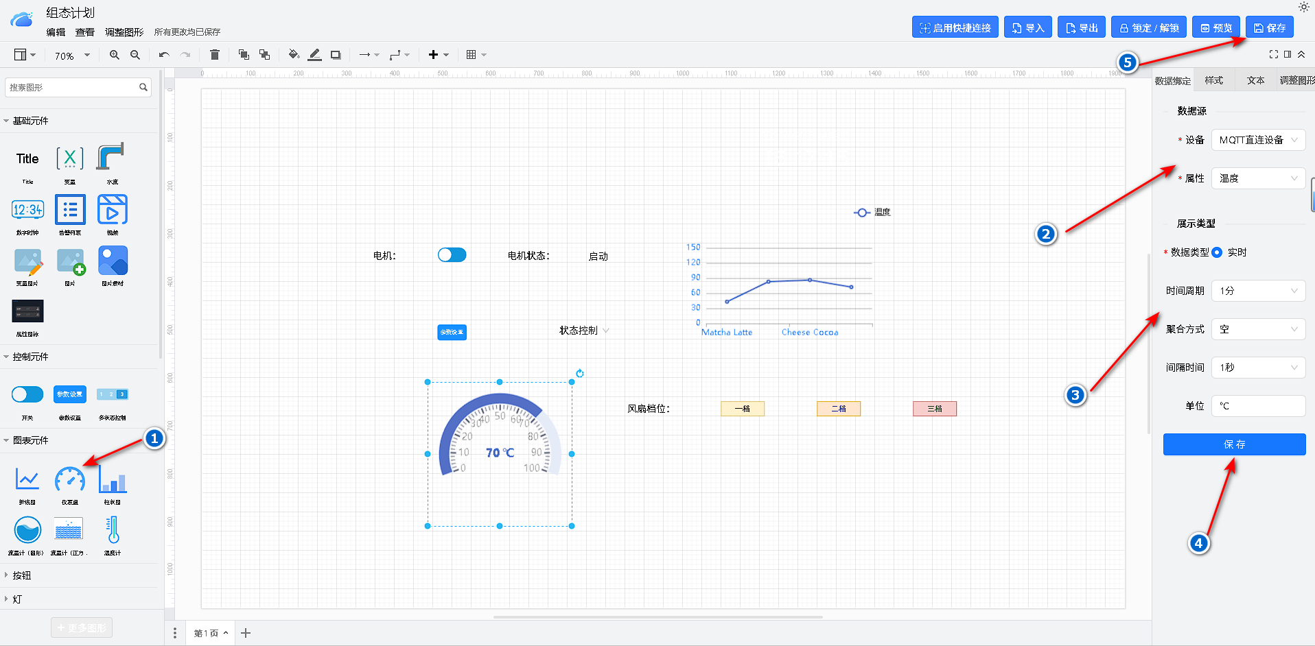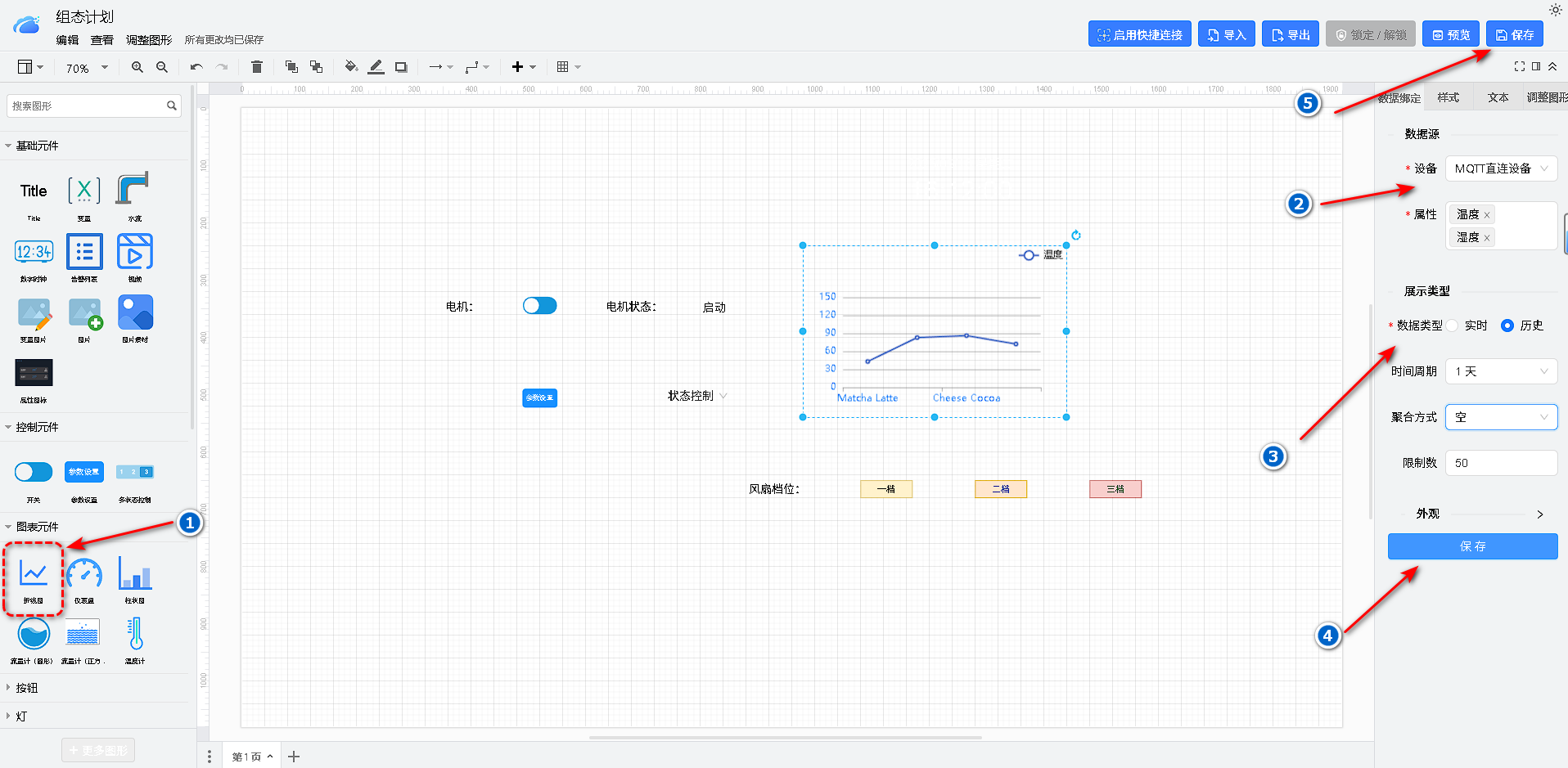 图表数据配置:通过设置某台设备的属性采用图表形式表达数据值。