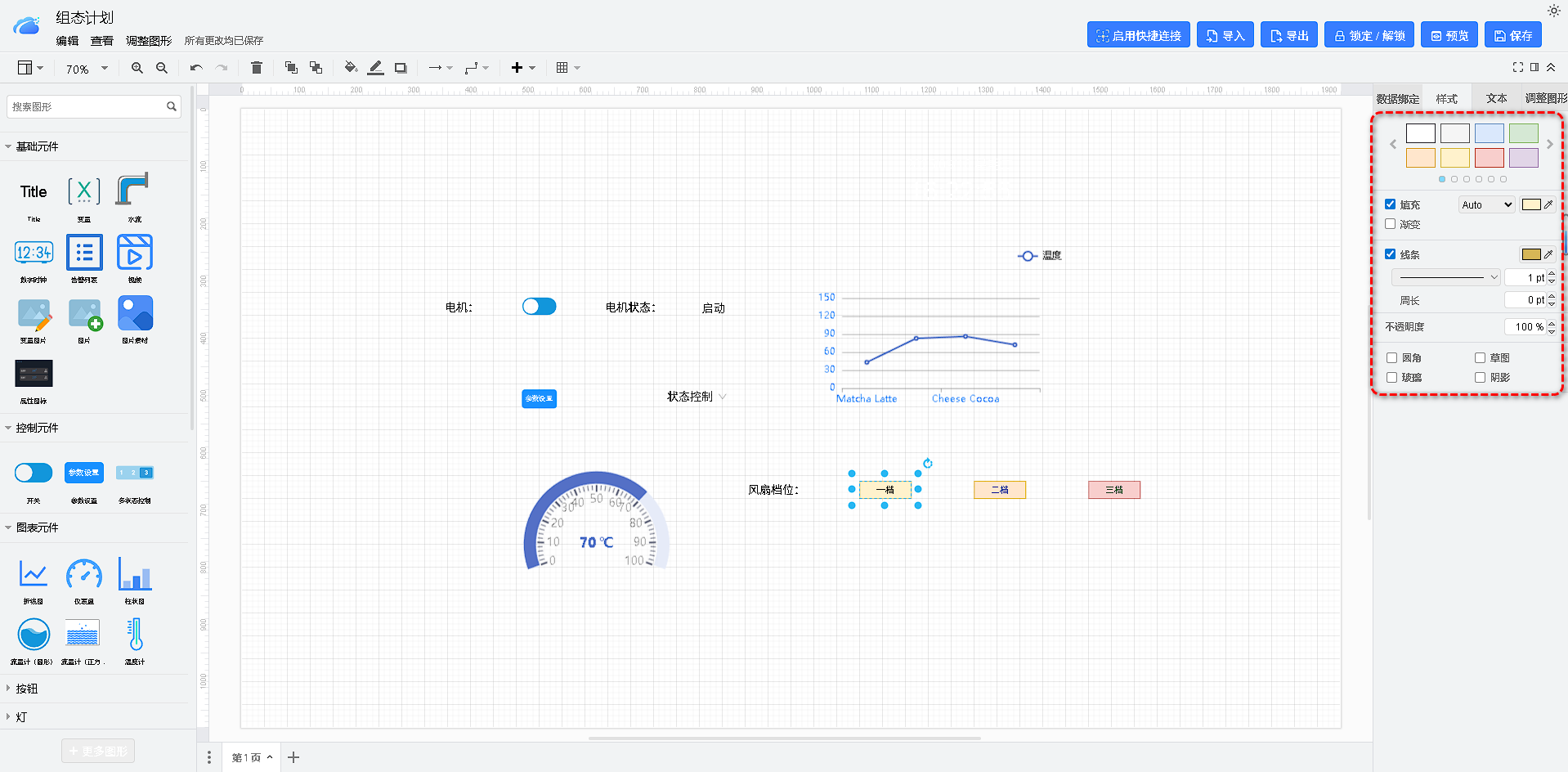 组态样式配置是指通过设置设计器中各个组件的样式属性,来改变它们的表现形式和外观。每个组件都有一些样式属性,如颜色、大小、字体、背景、边框等。通过改变这些属性,可以改变组件的外观和行为。