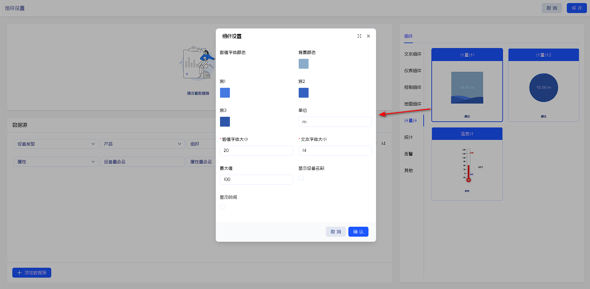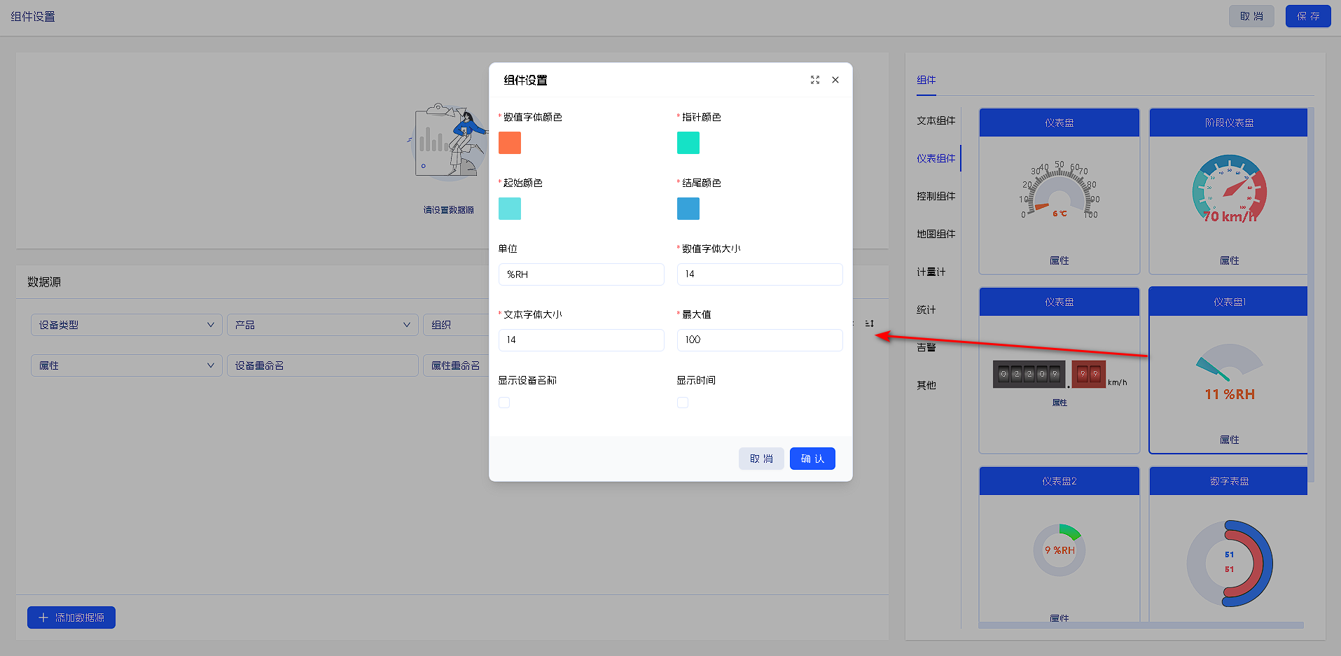 组件样式设置有:数值字体颜色、指针颜色、起始颜色、结尾颜色、数值单位、☑是否显示设备名称、☑是否显示时间。