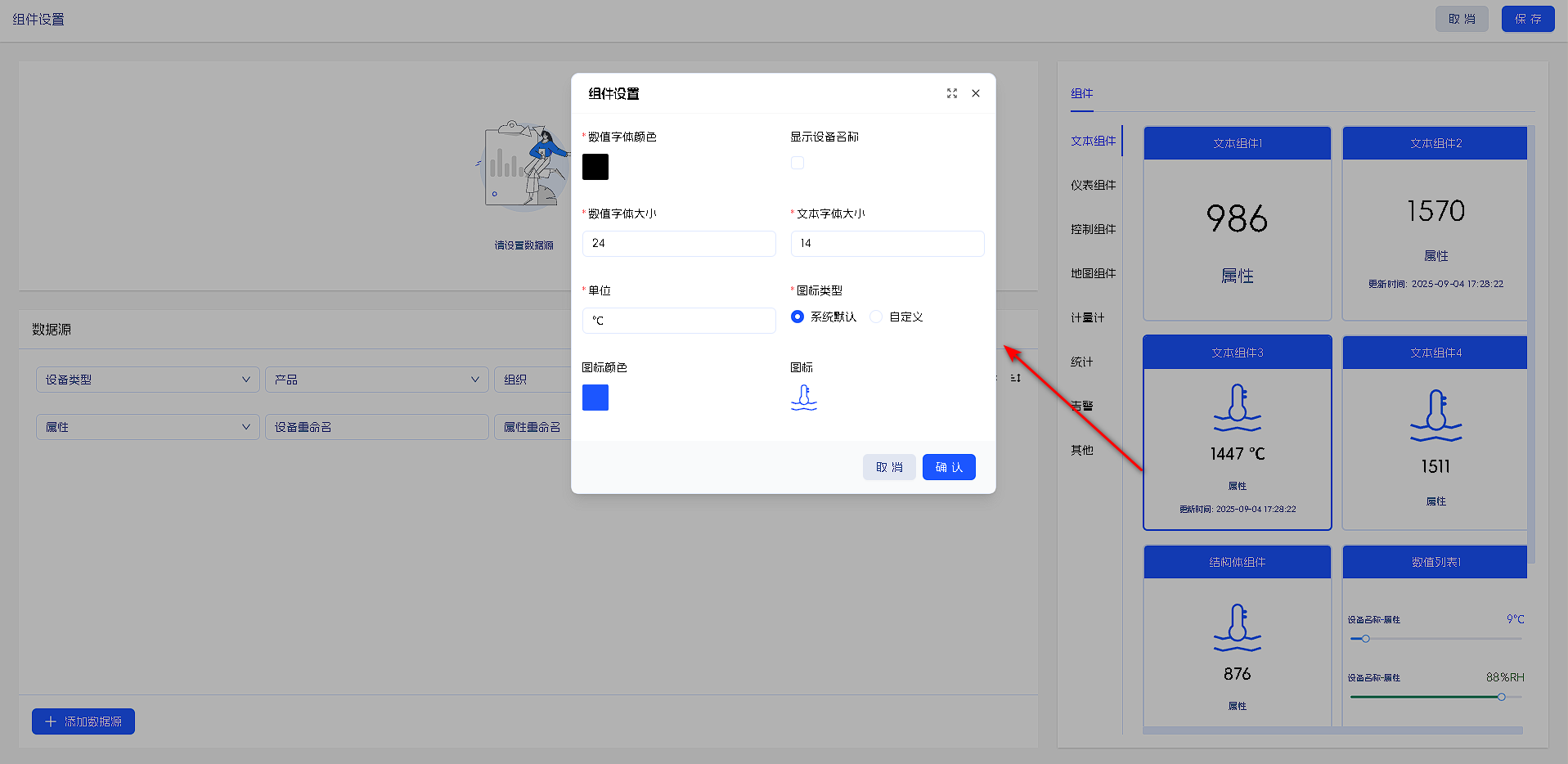 组件样式设置有:数值字体颜色、单位、文本大小、☑是否显示设备名称、☑是否显示时间。