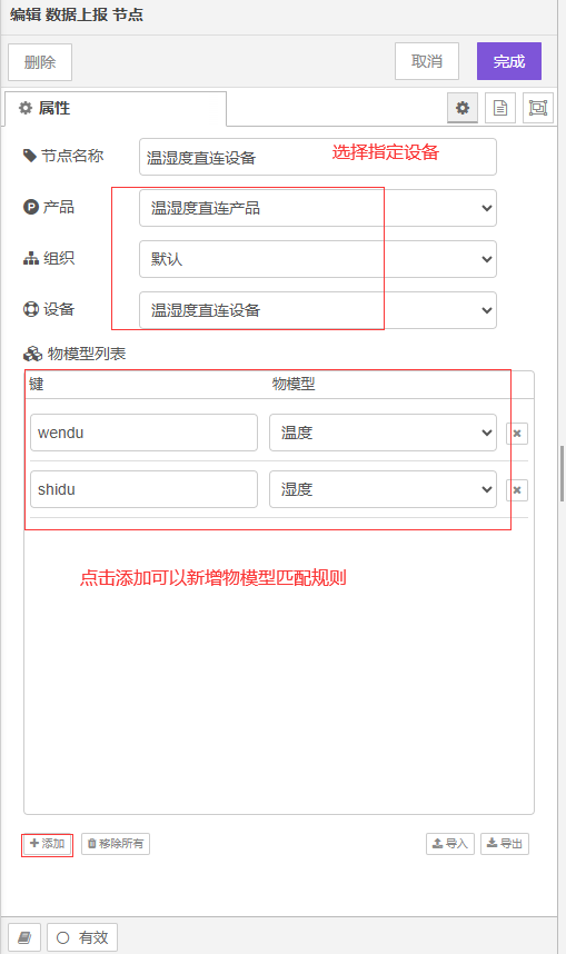 注意:如果采集到的数据key与物模型定义的Key不一致,此时则可以利用该节点中的物模型列表进行关联;单击下面的【添加】按钮,然后选择你对应的物模型。