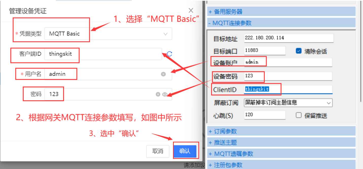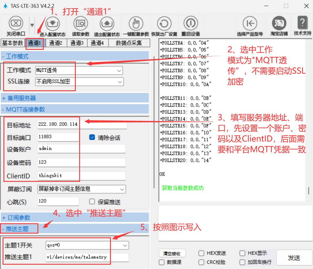 此处使用默认使用“通道1”配置网关与ThingKit平台之间的MQTT协议连接: