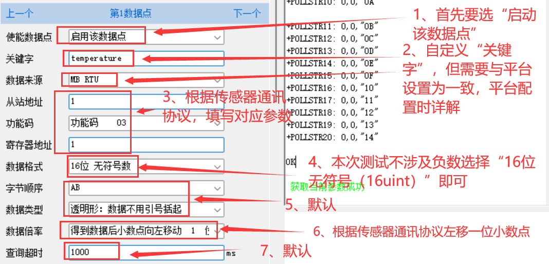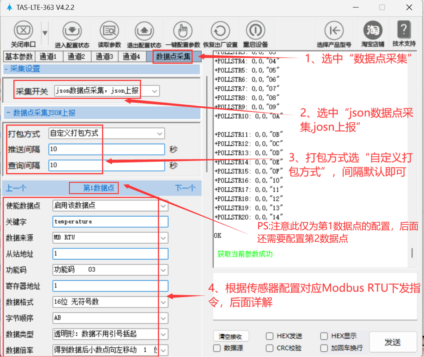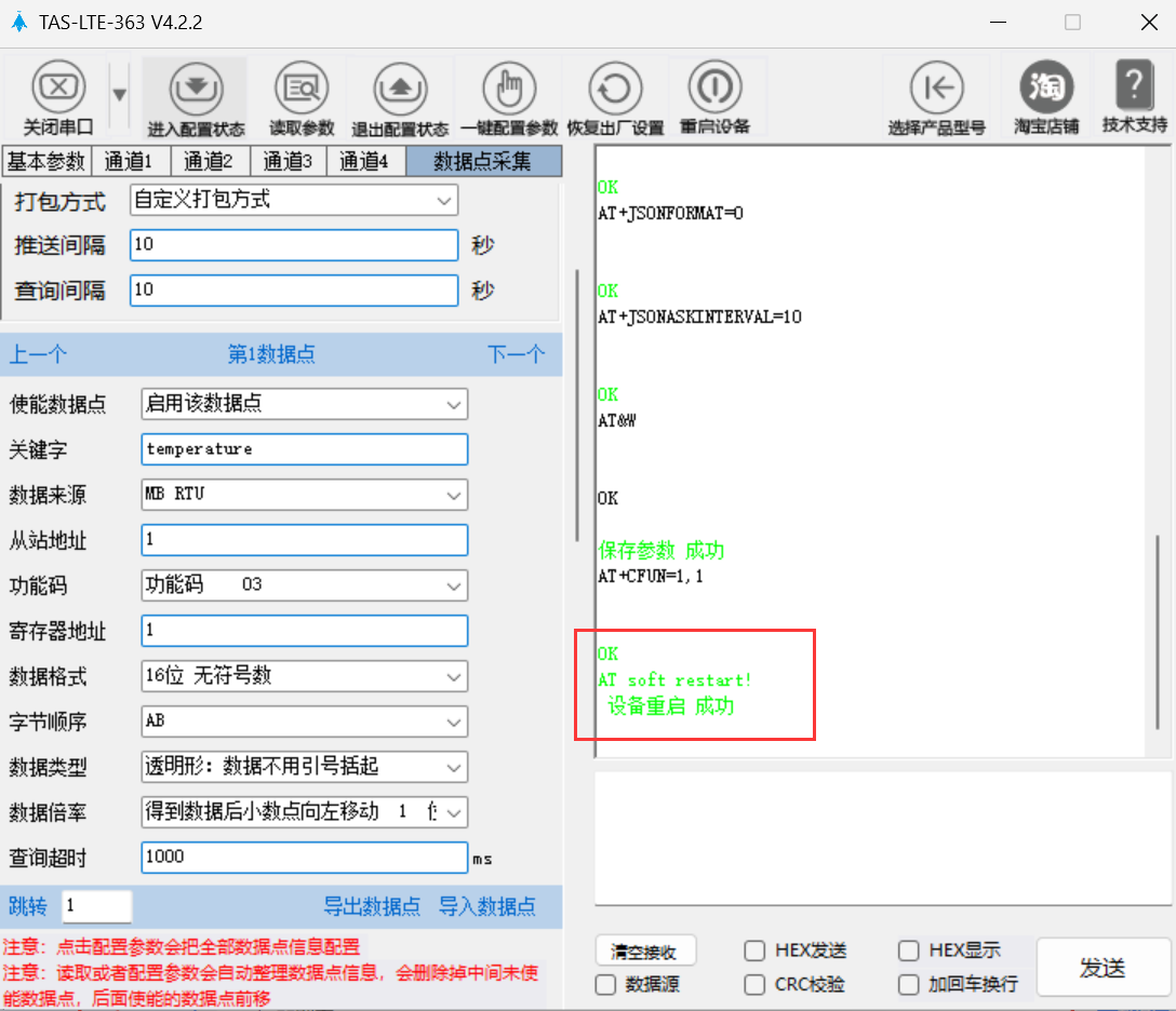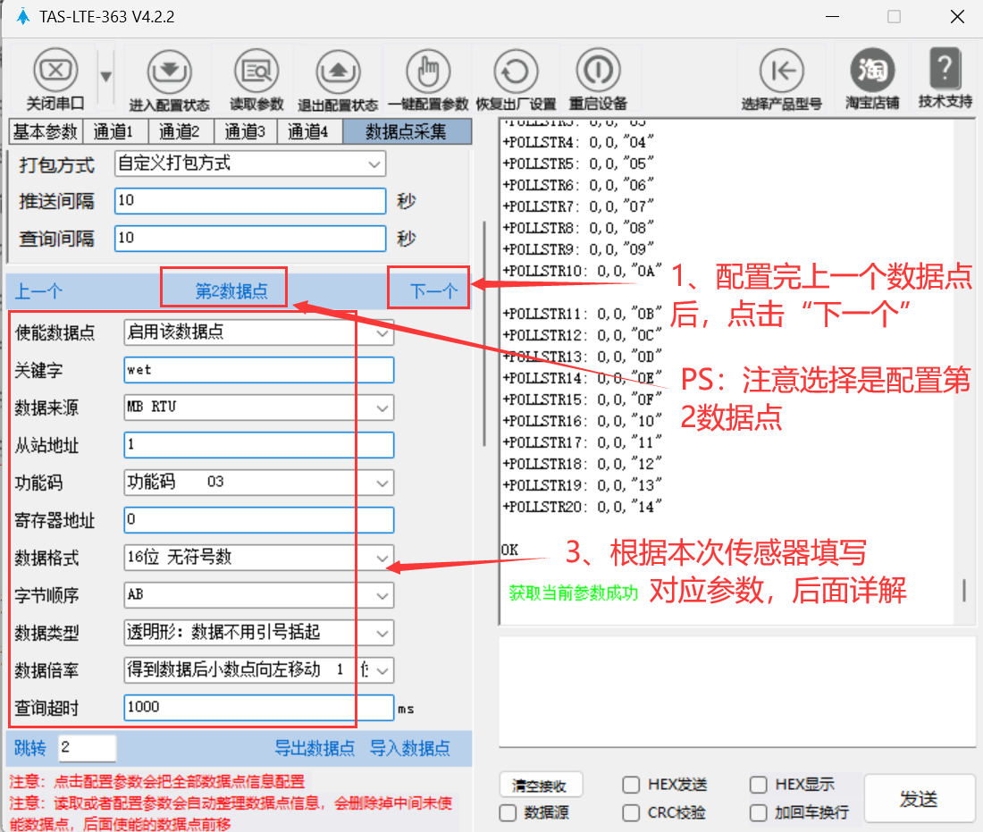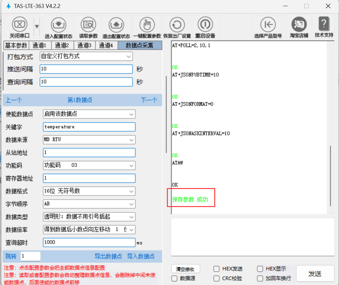 PS:由于塔石TAS-LTE-892C网关的json格式传输每一个数据点只能传递一个寄存器长度的数据,所以要检测两个寄存器(温度和湿度)就需要两个数据点,数据点采集设置需要按照现场情况调整,下图为数据点配置详解