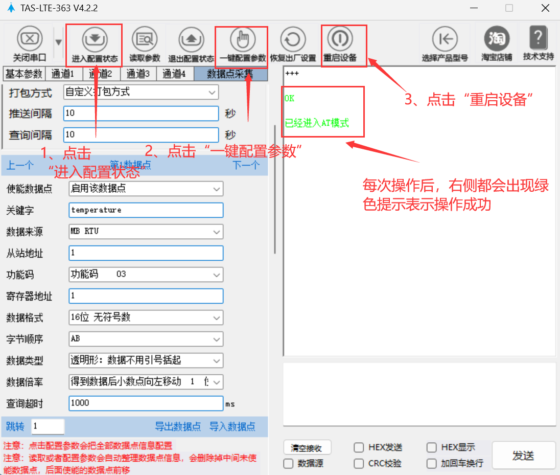 网关参数设置成功后都需要“进入配置状态”、“一键配置参数”并重启网关: