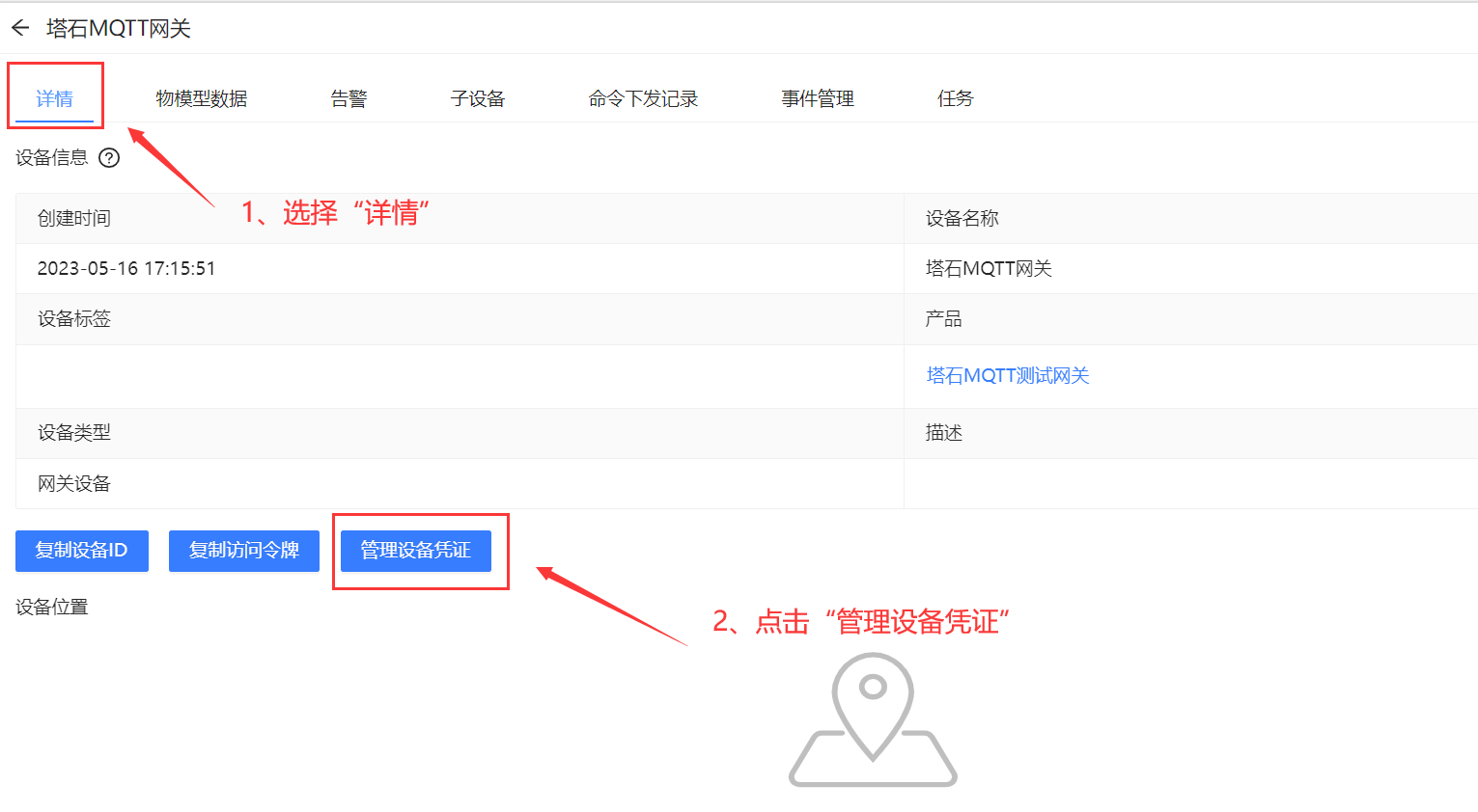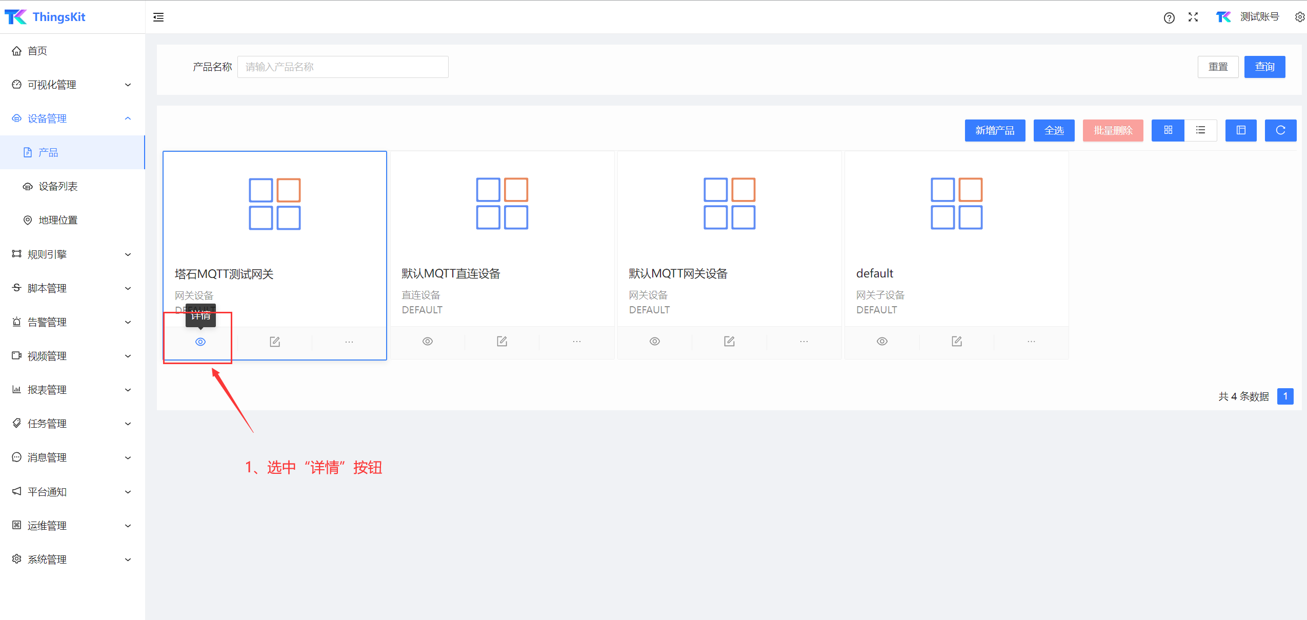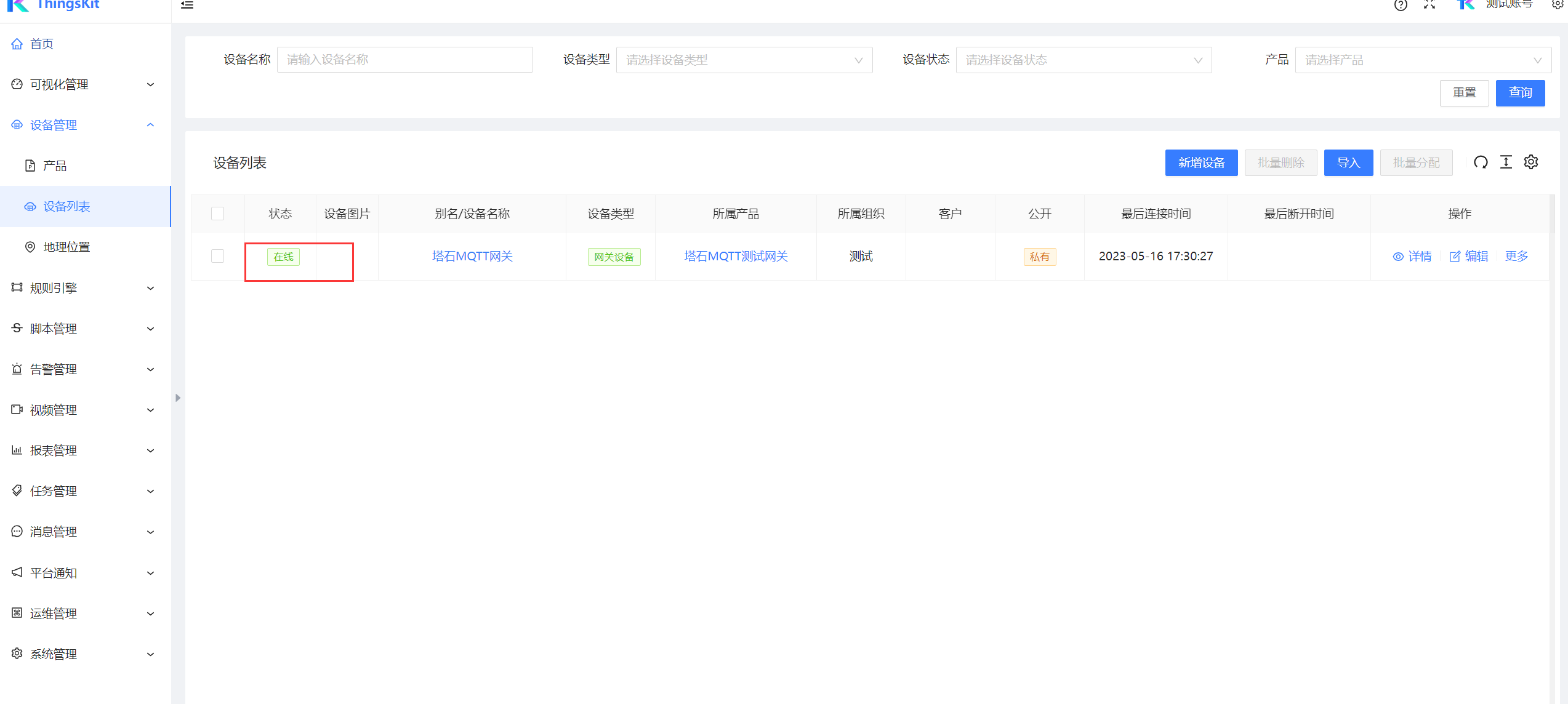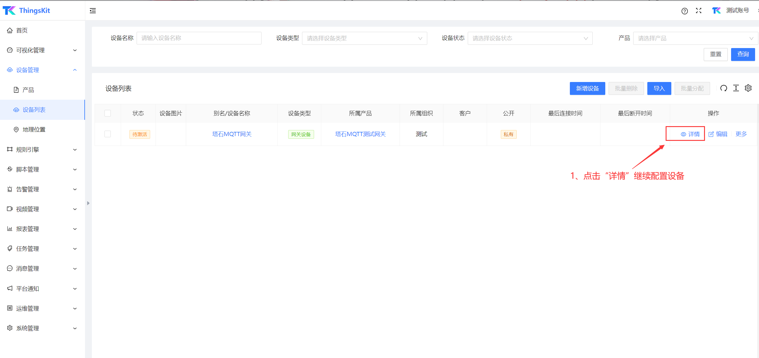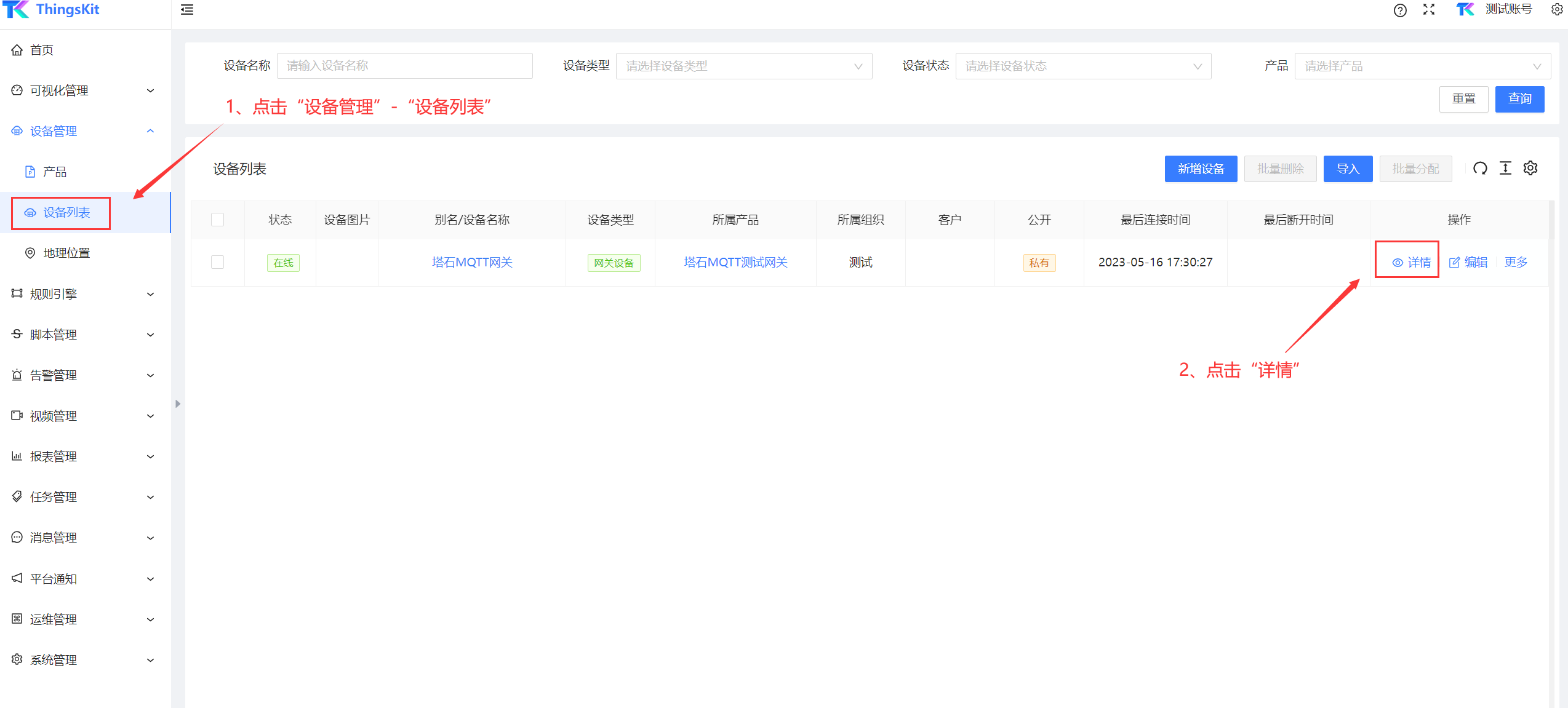 创建好网关并配置网关4G卡可以正常通讯后,在“设备列表 ”,确定网关上线(如果设备未上线,重启网关或检查设置),点击测试网关设备“详情 ”: