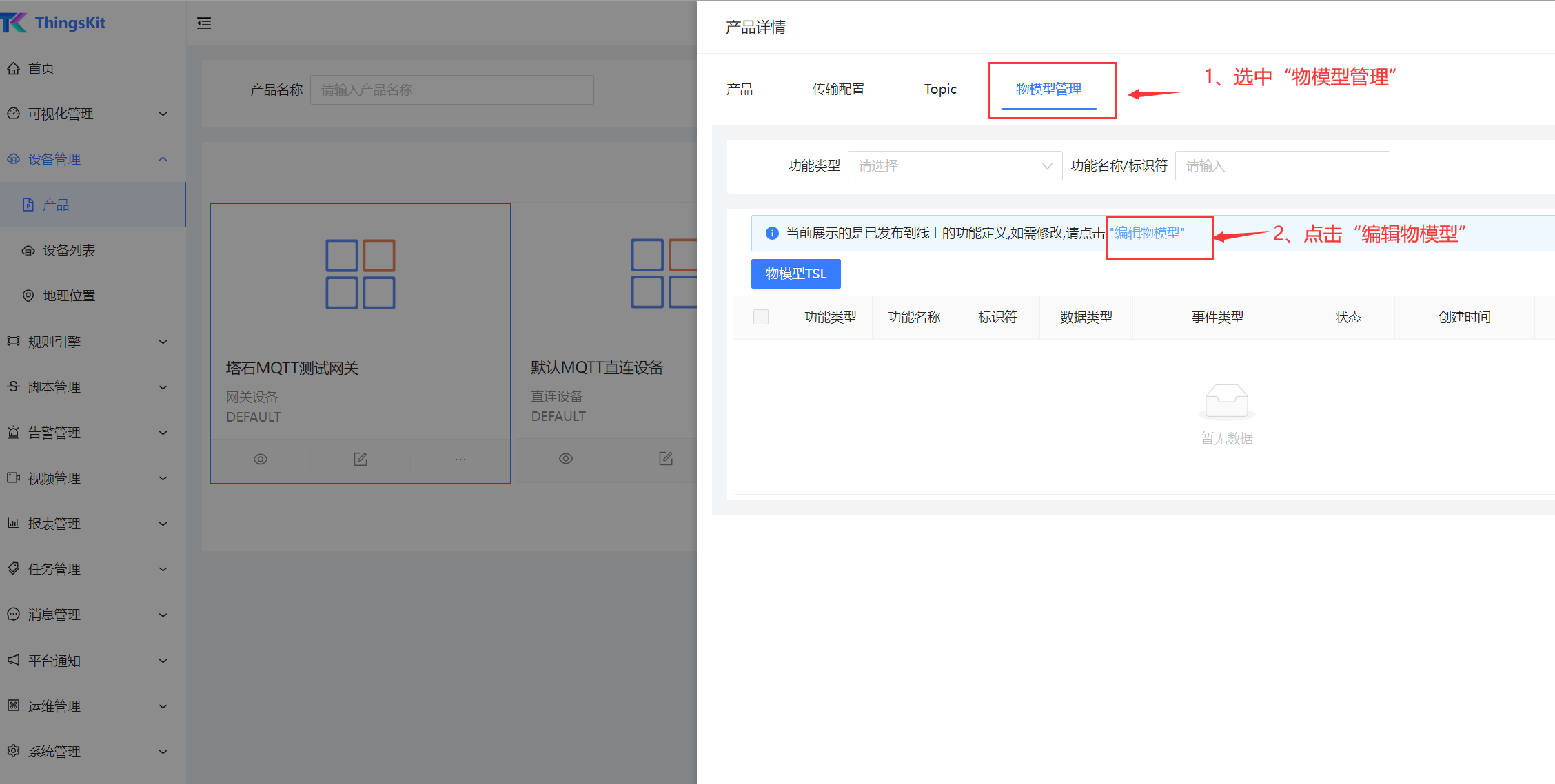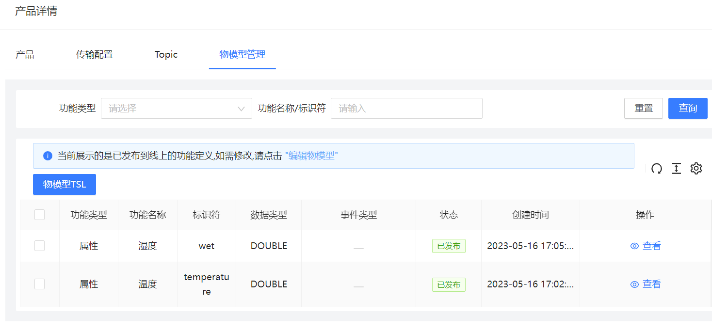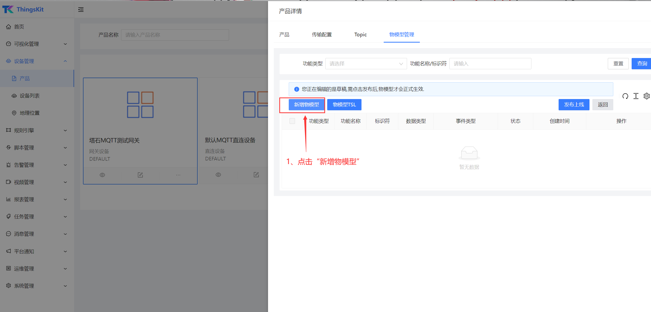 PS:首次创建产品后效果如下图展示,然后我们来创建本次测试网关的物模型