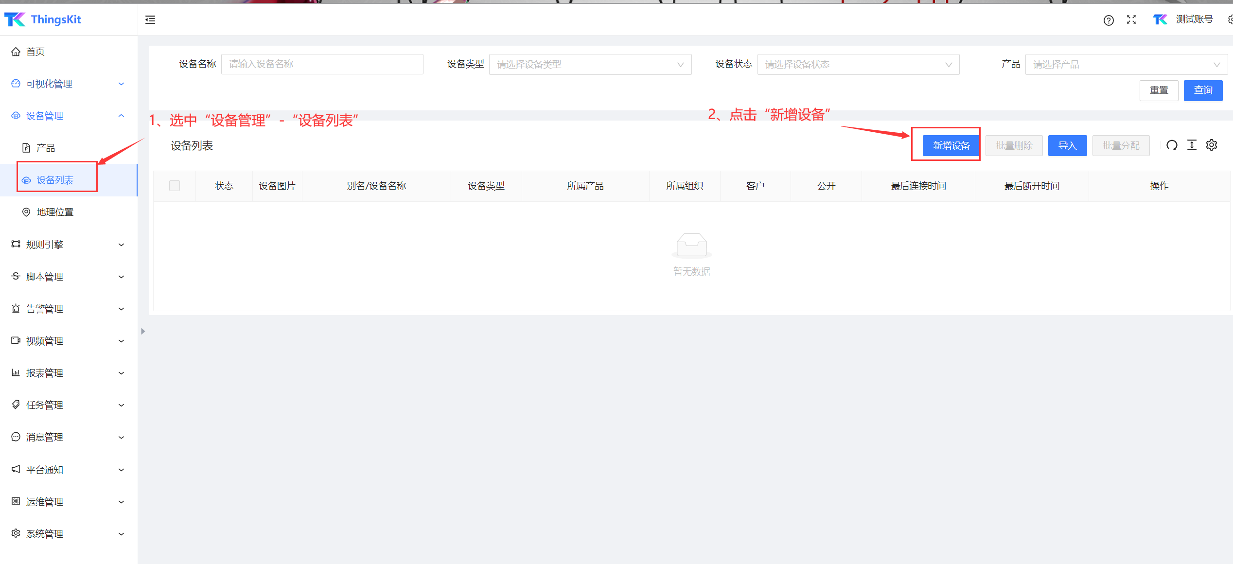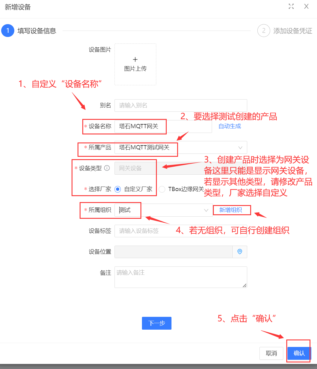 创建塔石网关的产品后,在“设备列表”处添加网关设备: