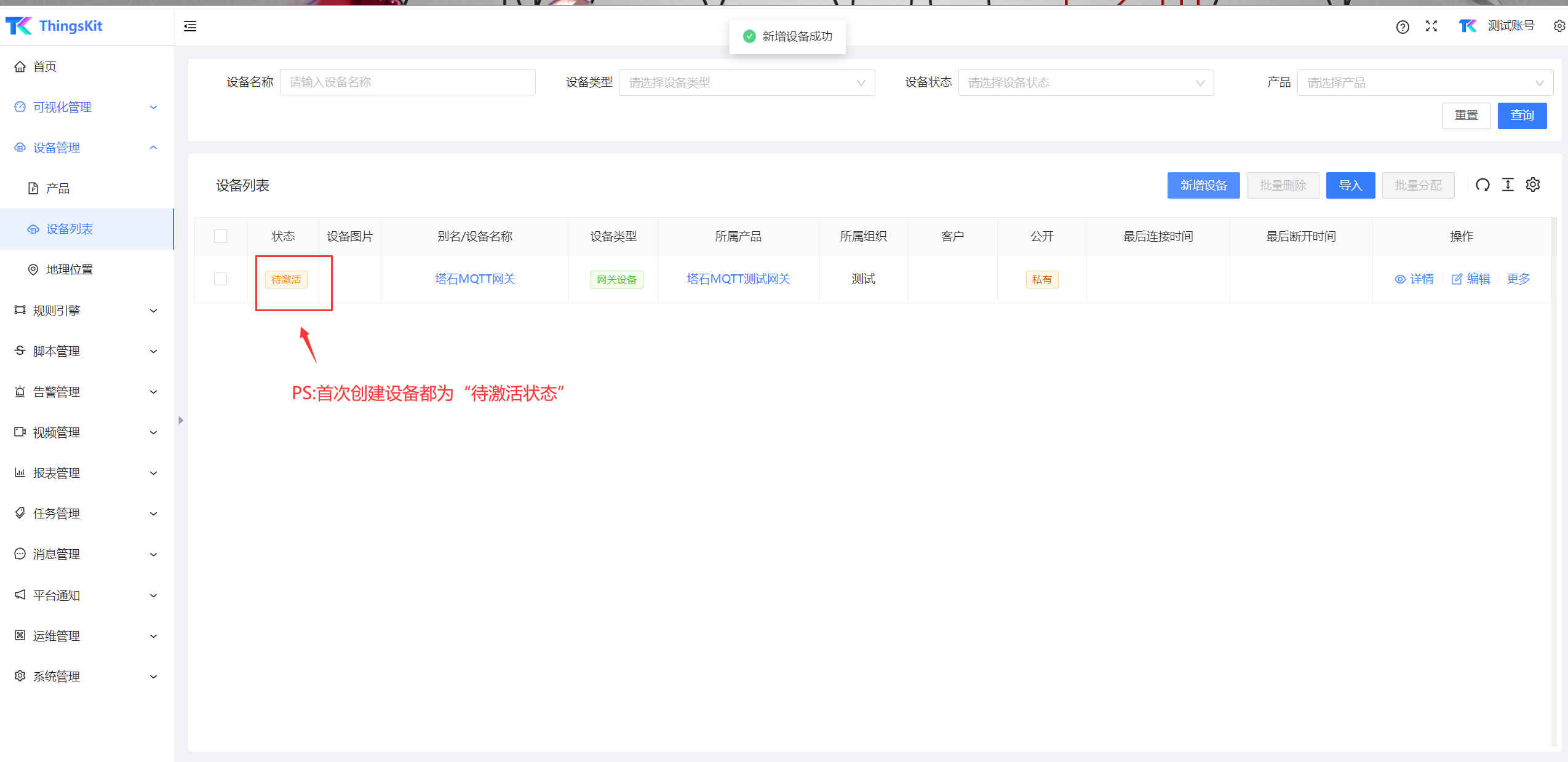 PS:所有步骤完成后,效果如下图,设备状态改变为“在线”: