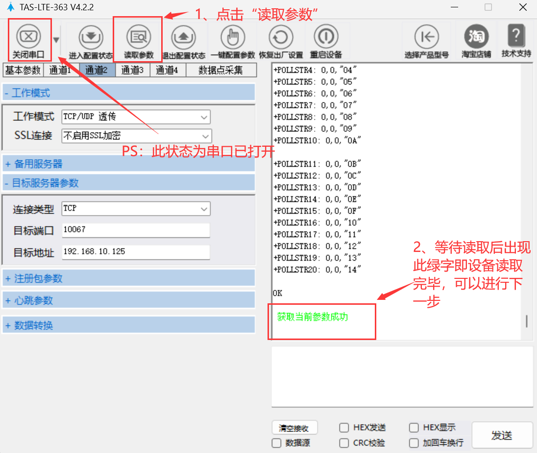 单击“一键配置参数 ”;需要看到右侧,日志栏“保存参数 成功 ”绿色字样;见图2-5-2单击一键配置参数