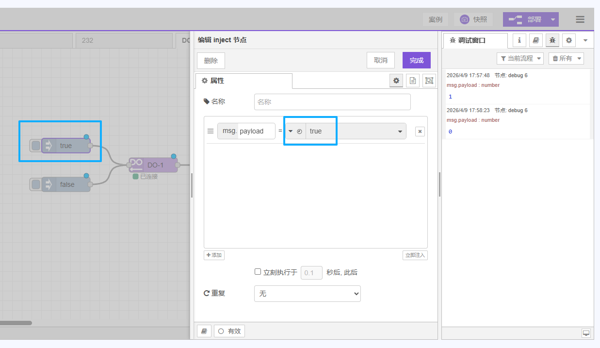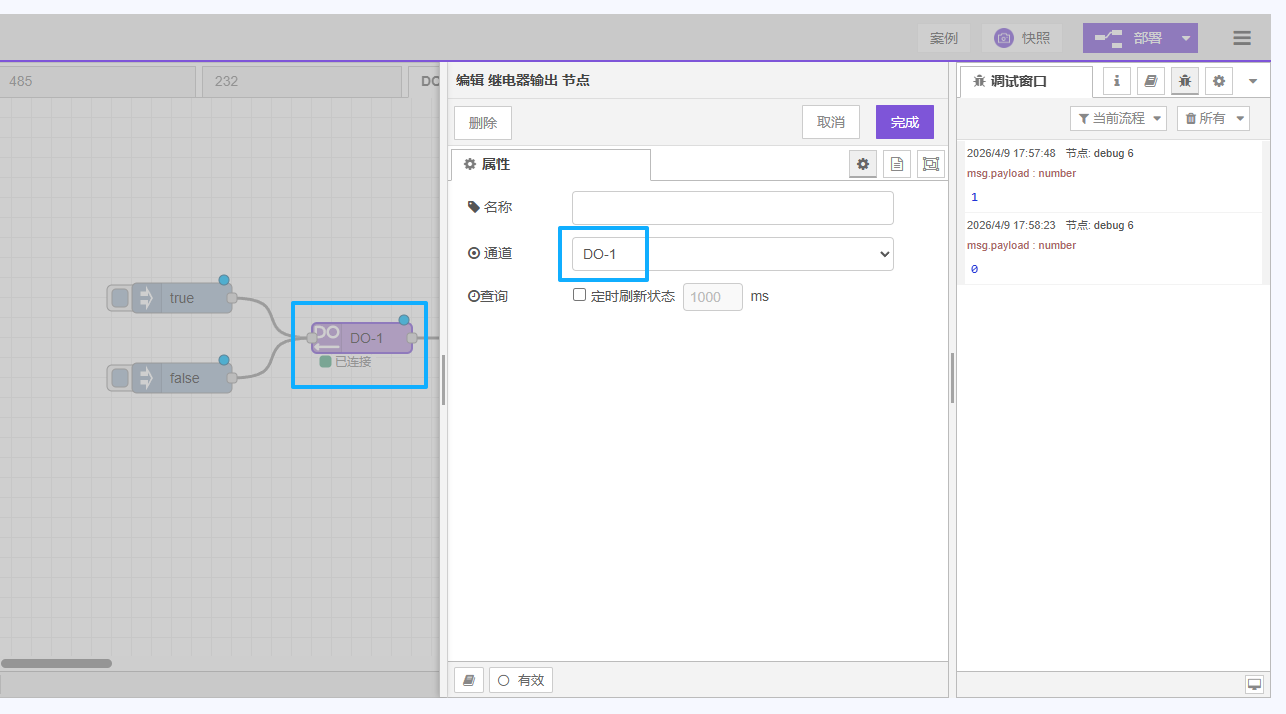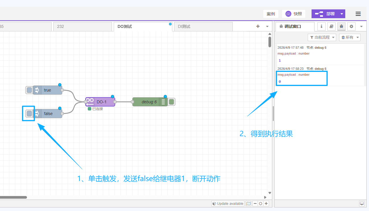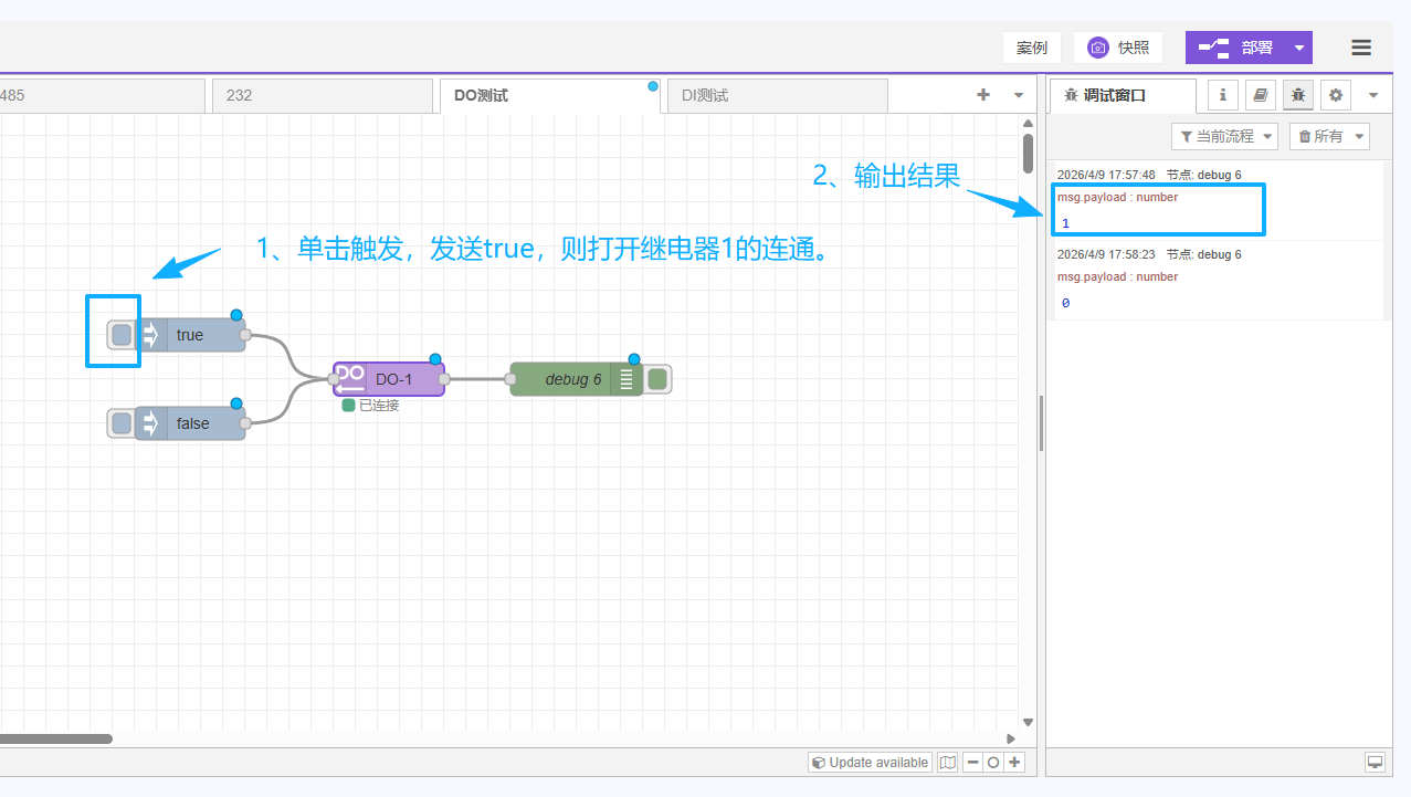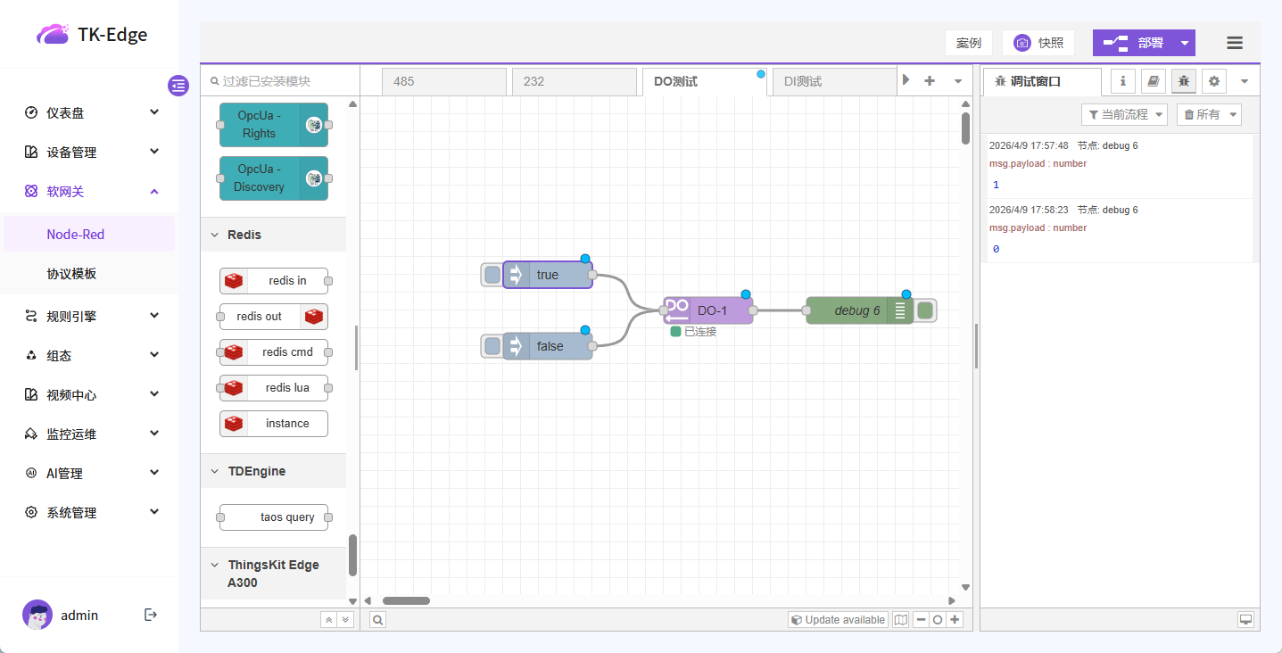 边缘计算网关自带2路继电器输出(DO),可以通过对DO节点写入1/0或者true/false来实现控制继电器的吸合或者断开。