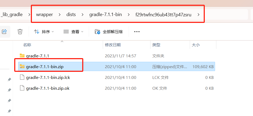 例如gradle-7.1.1-bin.zip放入对应的目录wrapperdistsgradle-7.1.1-binf29rtwfnc96ub43tt7p47zsru下。