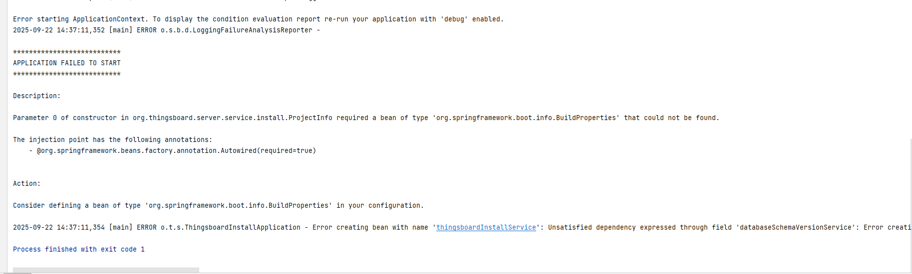 初始化数据库时,提示Paraneter 8 of canstructor in org.thingspoard.server,serwvice. install.projectInfo reguired a bean of type "org.springfraneon’k.bot.info.Buildproperties" that could not be found.