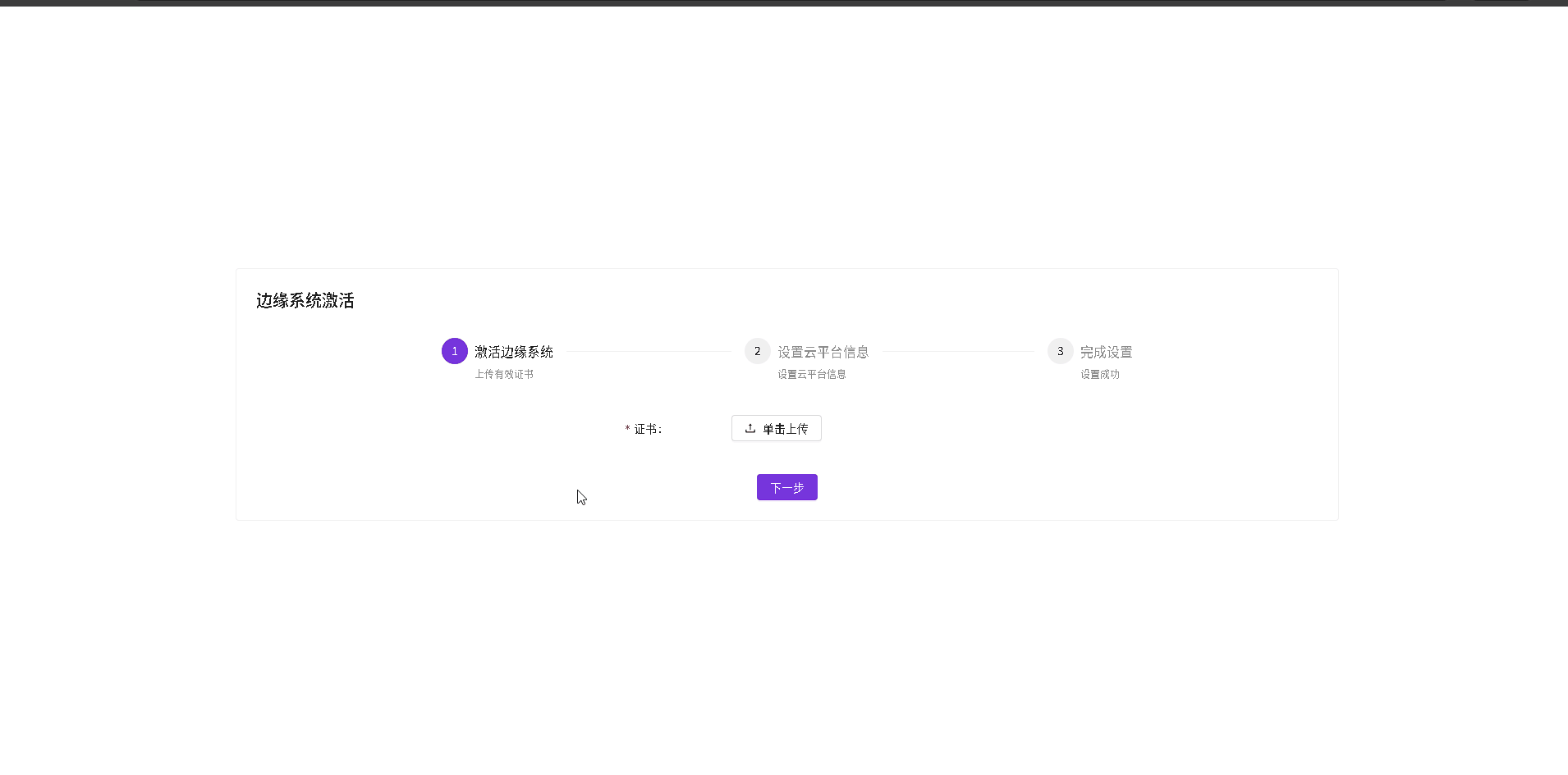 第二步,设置云平台信息,如果不使用云平台可点击关闭按钮,点击下一步,进入初始化状态。如果开启接入平台,则需要将云端平台地址和端口,租户边缘实例的边缘键和边缘密钥进行复制填入。