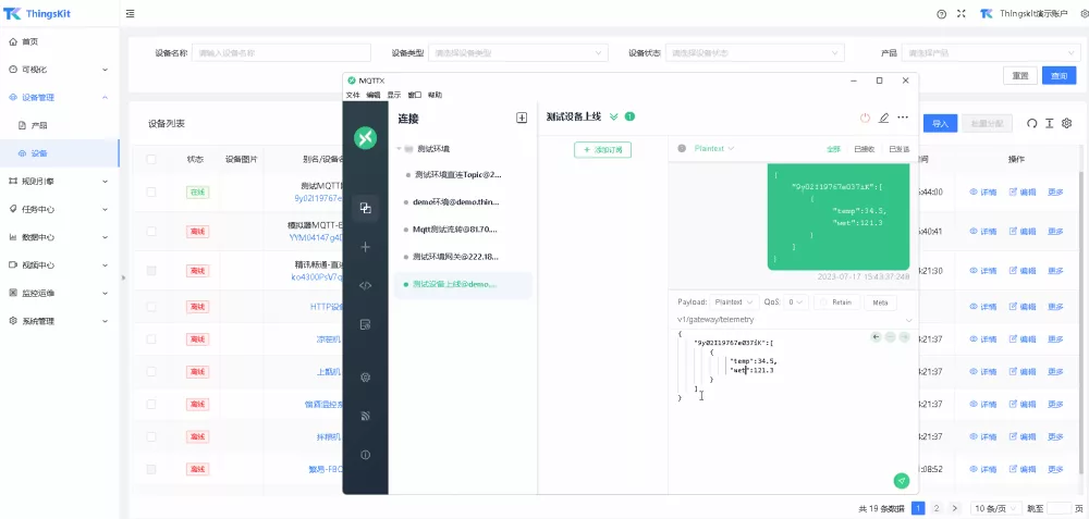 相关推荐: ThingsKit物联网平台设备数据上报模拟数据上报 为产品增加物模型 通过MQTTX上报数据 通过MQTTX模拟设备上报数据,消息Topic和上报格式如下: v1/gateway/telemetry 构建上报数据 {“9y02I19767e037iK”:[ {“temp”:34.5, “wet…