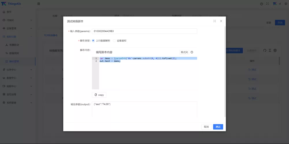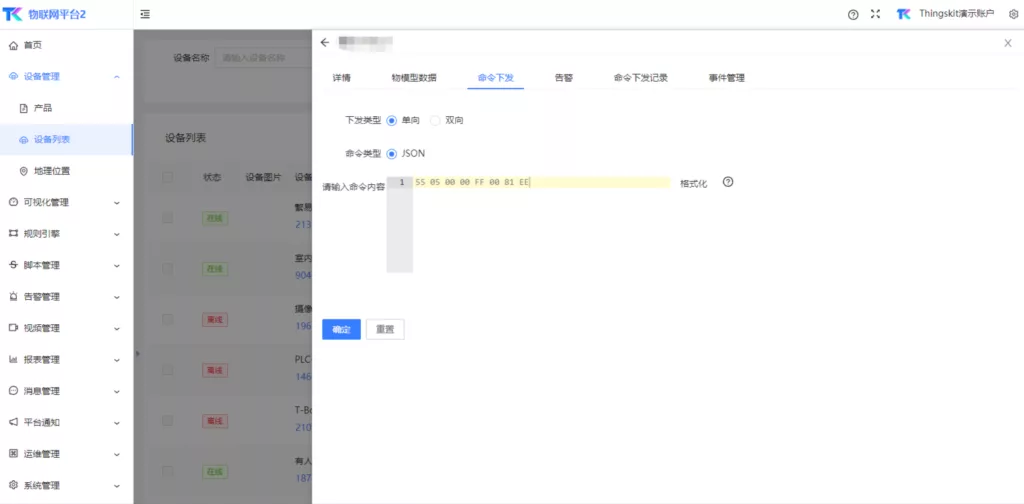 ThingsKit支持设备直接通过UDP接入平台,并支持 JSON、Text、HEX格式的上下行消息,平台中还提供了脚本函数功能,为更复杂的设备通信提供了便利性。