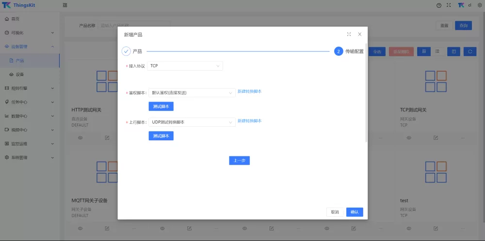 设备接入时,咱们得先创建UDP协议的产品,产品创建时,需要绑定对应的转换脚本。