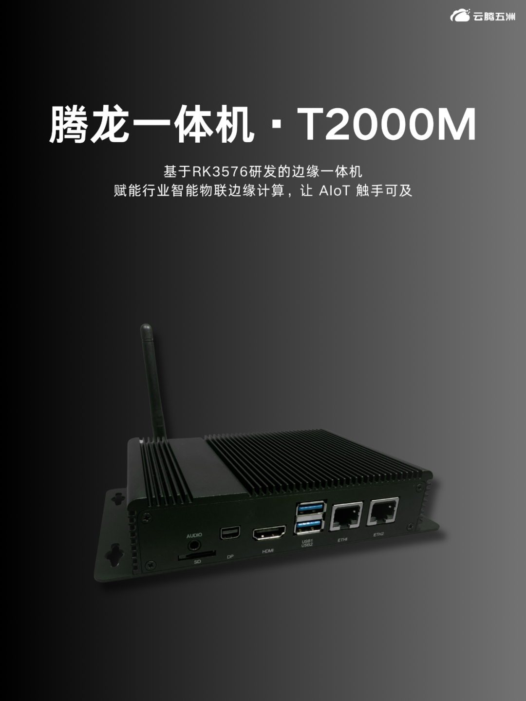 云腾五洲-小A 2025年3月10日2025年3月11日 云腾五洲腾龙T2000是一台强大的边缘计算AIoT一体机设备。它以瑞芯微RK3576为处理器,配备四核Cortex-A72(2.2GHz)与四核Cortex-A53(1.8GHz),性能出色且能效比高。内置6 TOPS算力的NPU,支持多种AI框架模型转换,预装YOLO v10物体识别算法,可实现物体、人脸、车辆等多种识别功能和语义分割。其搭载的AIoTedge软件平台,支持零代码组态设计和NodeRED流式编程,用户无需编程经验,通过拖拽海量节点就能快速编排业务流程,实现本地设备接入管理、数据存储展示,还支持断网续传、远程运维等功能,可作为高效的IT/OT中间件,助力各行业智能化升级,广泛应用于智能制造、智慧城市、智慧农业等领域。 01. 产品介绍 02. 尺寸与参数 END. 如需帮助,请联系客服 云腾五洲-小A 「云腾五洲」致力于通过AIoT与边缘计算的深度融合,打造下一代智能物联基础设施。以强大的物联网平台xAI边缘计算引擎为核心,赋能工业、能源、交通、城市等全场景智改数转,帮助企业突破数据与算力边界、推动IT与OT的融合,实现更高效、更智能的未来。